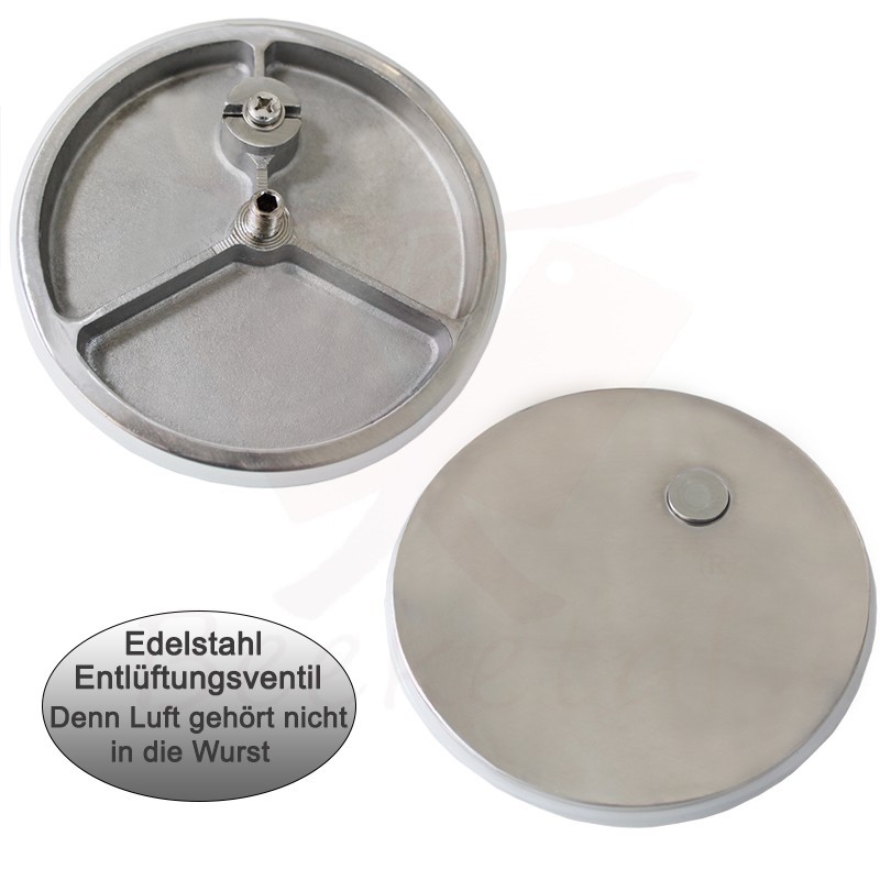 Diese Wurstfüller besitzen außerdem ein Entlüftungsventil auf der Oberseite des Druckstempels, mit der überflüssige Luft im Füllgut abgelassen werden kann. In der Druckplatte des Druckstempels befindet sich eine hochwertige Silikondichtung.