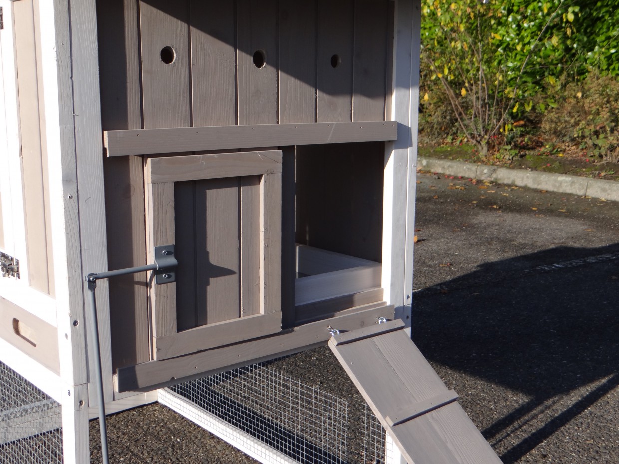 • Dieser Hühnerstall ist mit einem Nistkasten ausgestattet.