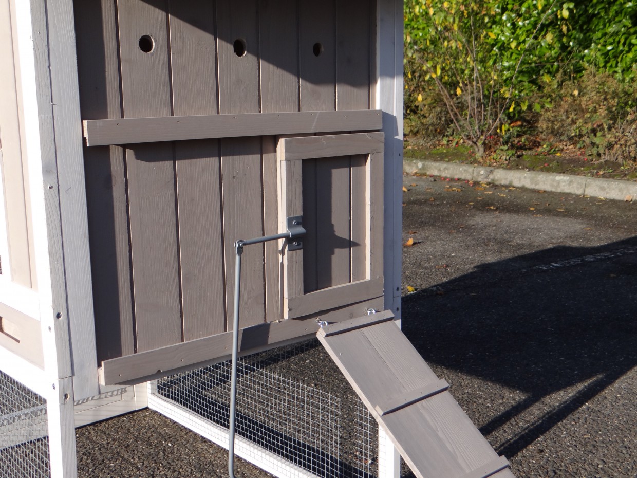 • Die Türen dieses Hühnerstalls sind mit Doppelschlössern ausgerüstet.