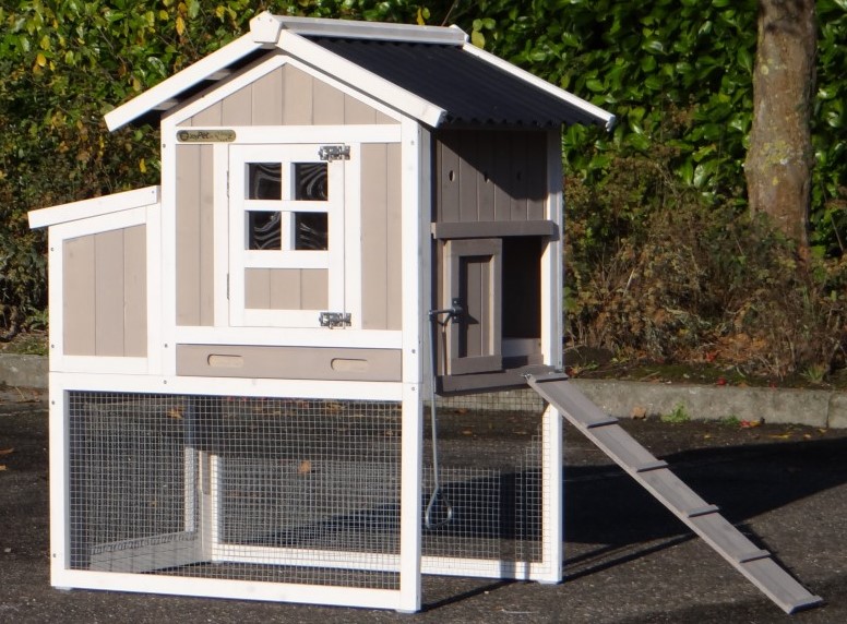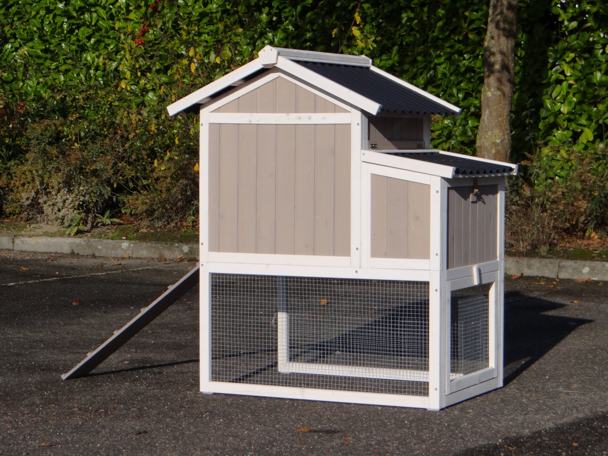 • Der Hühnerstall hat ein Dach aus Kunststoff
