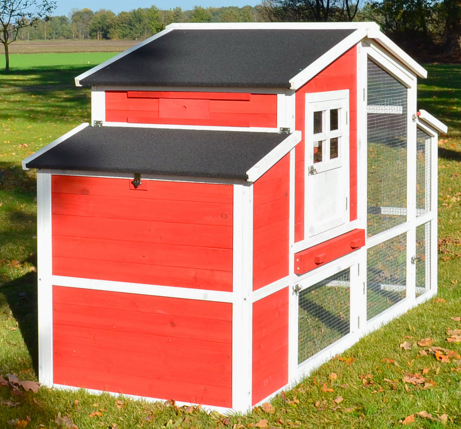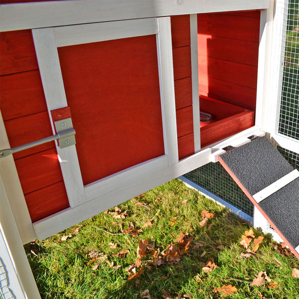 Der komplette untere und rechte Teil dient als Freilaufgehege, wo Ihre Hühner scharren, picken, spazieren und in der Sonne dösen können. Der gemütliche Stallbereich ist über eine Hühnerrampe erreichbar, kann aber auch durch eine Schiebetür von außen verschlossen werden. Hier finden Ihre Tiere einen ruhigen und wettergeschützten Rückzugsort. Der Stallbereich hat nach vorne eine hübsche Tür mit Sprossenfenster, durch die Sie Ihre Hühner oder Ihren Hahn greifen oder den Innenbereich reinigen können. Außerdem hat der Stall seitlich ein Lüftungsloch, welches bei kühleren Temperaturen mit einem Schieber geschlossen werden kann.