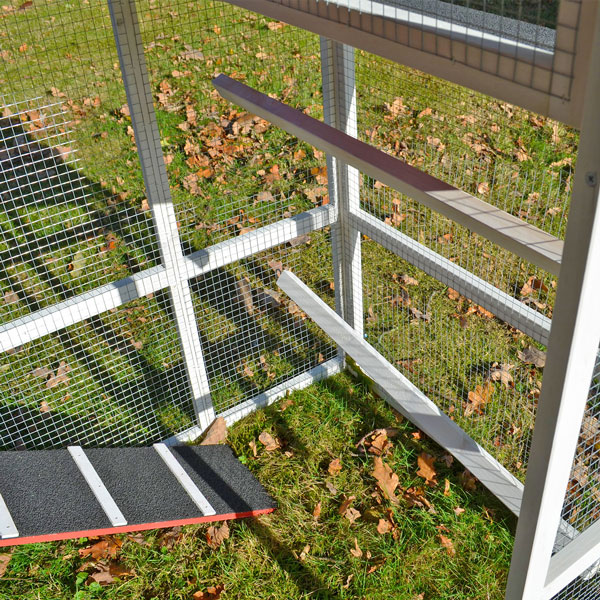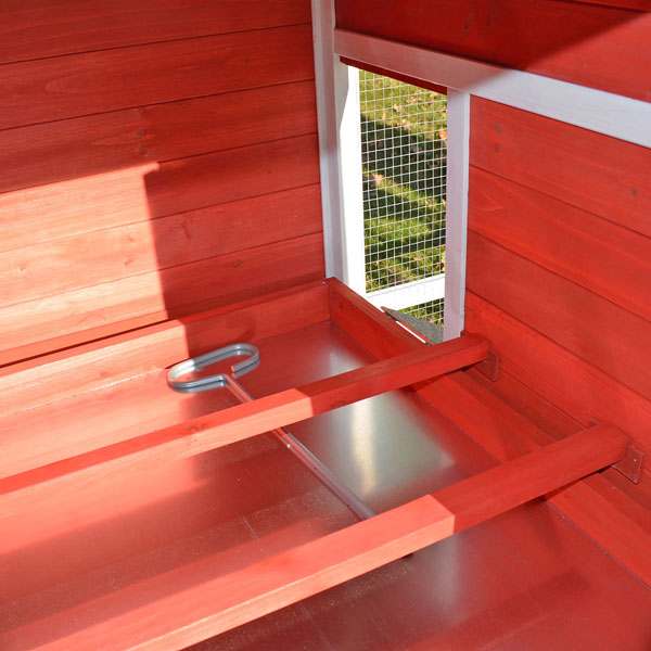 Unter dem Stallbereich ist eine Kotschublade. Diese können Sie zur Reinigung einfach und komfortabel herausziehen und entleeren. Zwei Sitzstangen bieten Ihren Hühnern hier ein bequemes Plätzchen und der Kot fällt nach unten in die Mistschublade. Auch im Hühnergehege finden Ihre Tiere zwei weitere Sitzstangen, die Sie variabel in der gewünschten Höhe anbringen können.