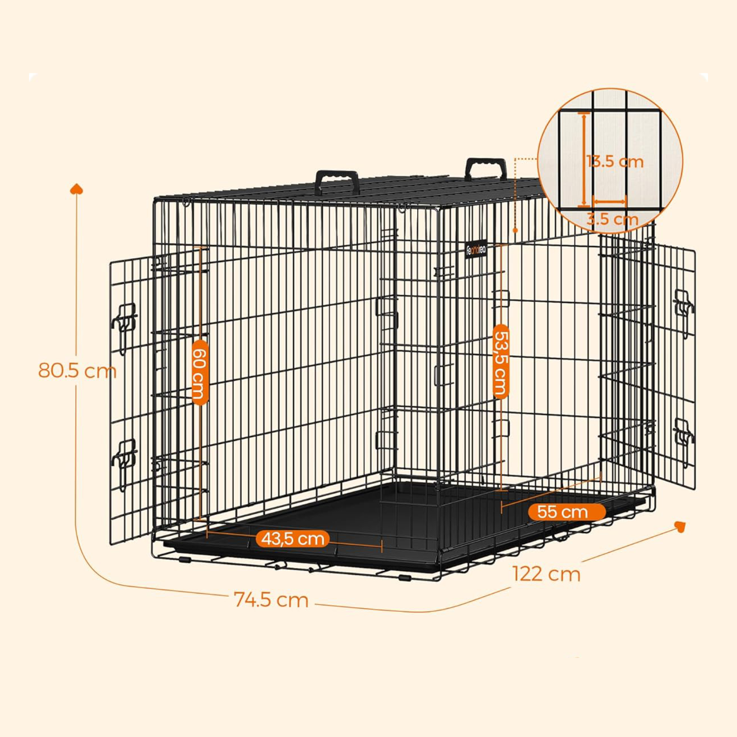 Faltbarer Drahtkäfig mit abnehmbarer Trennwand und Bodenwanne.