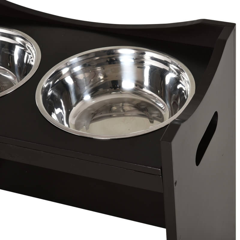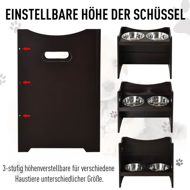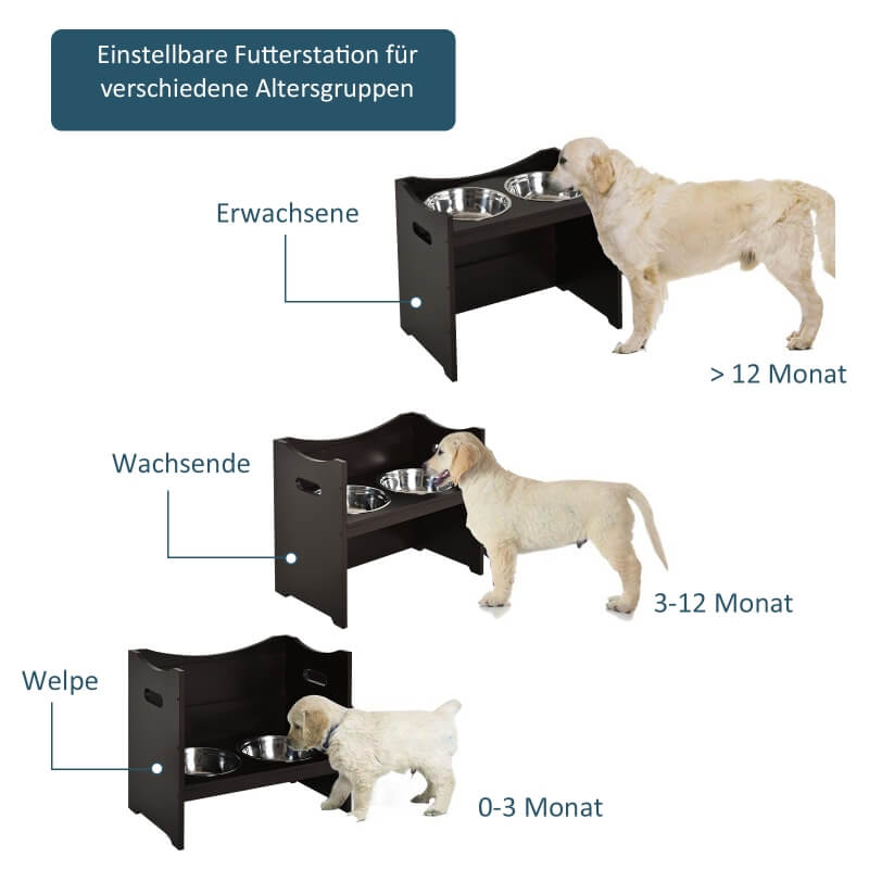 Diese Futterstation bietet eine bequeme und einfache Möglichkeit, Ihren lieben kleinen Freund zu füttern. Hergestellt aus solidem und natürlichem MDF-Material der Güteklasse P2, sowie Edelstahl, ist die Futterstation rostbeständig, ungiftig und robust. Der Napf ist abnehmbar, Sie können das Futter/Wasser leicht einfüllen und die Schalen einfach reinigen. Die Höhe des Fressnapf-Gestells ist 3-stufig einstellbar, so dass der Futterstation Ihren Hund vom Welpen bis zum hohen Alter begleiten kann. Außerdem kann der Ständer mit erhöhtem Design ausgestattet werden, was die Belastung für Nacken, Rücken und Gelenke des Hundes verringert. Darüber hinaus ist unser Futterstation aus dunkelbrauner Holzpaneelen, Sie können ihn mit Ihren anderen Wohnmöbeln kombinieren.