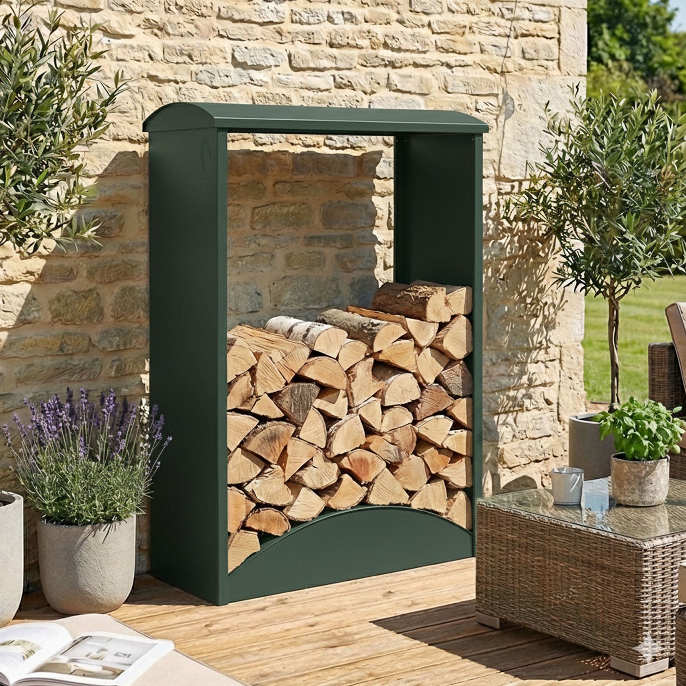 Dieses formschöne Brennholzlager ist die ideale Lösung für alle. die ihr Kamin- oder Feuerholz stilvoll und ordentlich aufbewahren möchten. Mit seinem modernen. schlichten Design und dem eleganten Rundbogen-Boden wird das Holzregal zum dekorativen Blickfang für jeden Außen- oder Innenbereich.