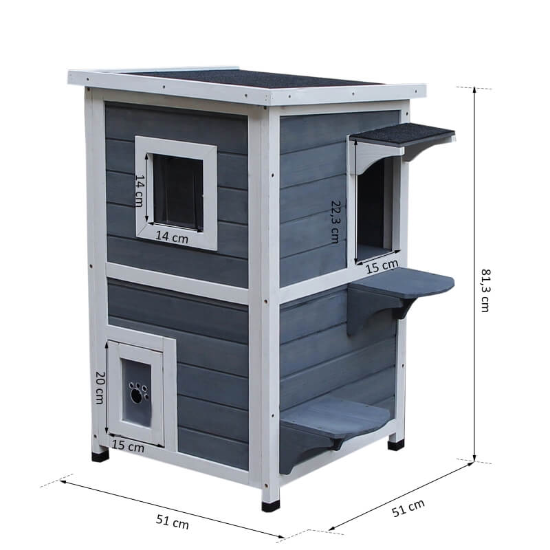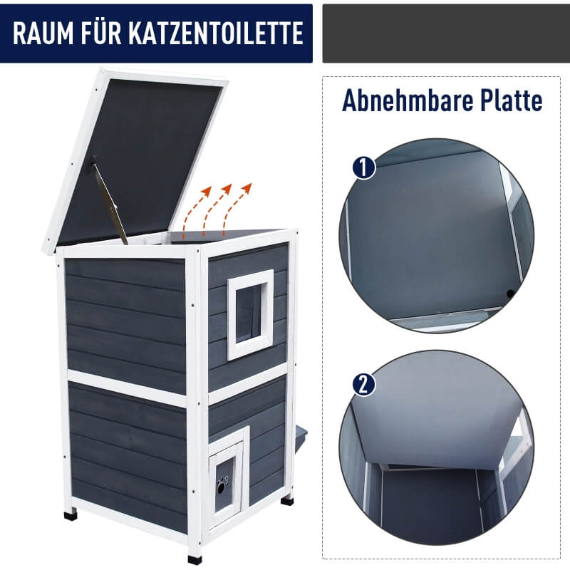 Das perfekte Heim für Ihre Katzen. Unser pflegeleichtes Katzenhaus aus Tannenholz bietet ihren kleinen Freunden nicht nur Schutz, sondern auch Spielmöglichkeiten und einen Rückzugsort. Ideal zum Spielen. Das leicht zu öffnende Oberteil und die abnehmbare Mittelplatte erleichtern das Aufstellen und Reinigen der integrierten Katzentoilette. Und dank dem intuitivem Lochdesign werden sogar Gerüche vermieden. Die Asphaltdecke, wasserfeste Bemalung und die erhöhten Füße machen das Katzenhaus ideal für drinnen und draußen, selbst bei schlechtem Wetter. Ihre Katze hat es verdient.