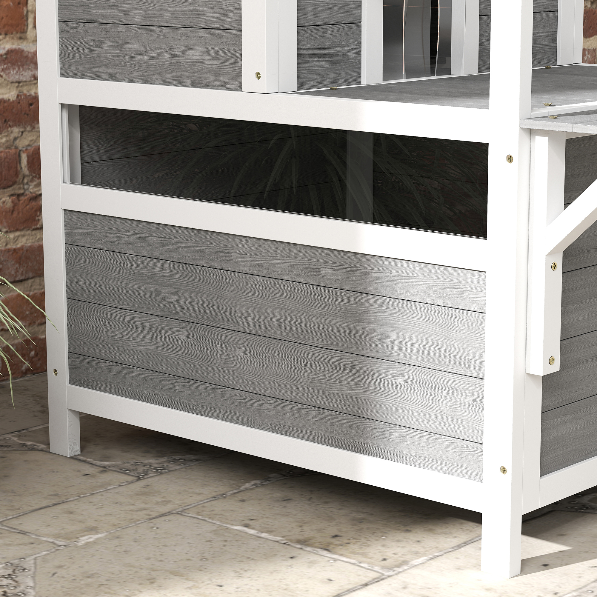 Erleben Sie das elegante Design dieser aus Tannenholz gefertigten Katzenhütte. die mit wetterfester Farbe und einem schützenden. geneigten Asphalt-Dach ausgestattet ist. Diese Katzenhütte bietet auf zwei Ebenen mit einem regengeschützten Balkon und mehreren Türöffnungen mit Vorhängen Platz und Komfort für 1-2 Katzen. Die robuste Bauweise macht sie ideal für den Innen- und Ausseneinsatz und sorgt für einen sicheren und gemütlichen Rückzugsort für Ihre Katzen.