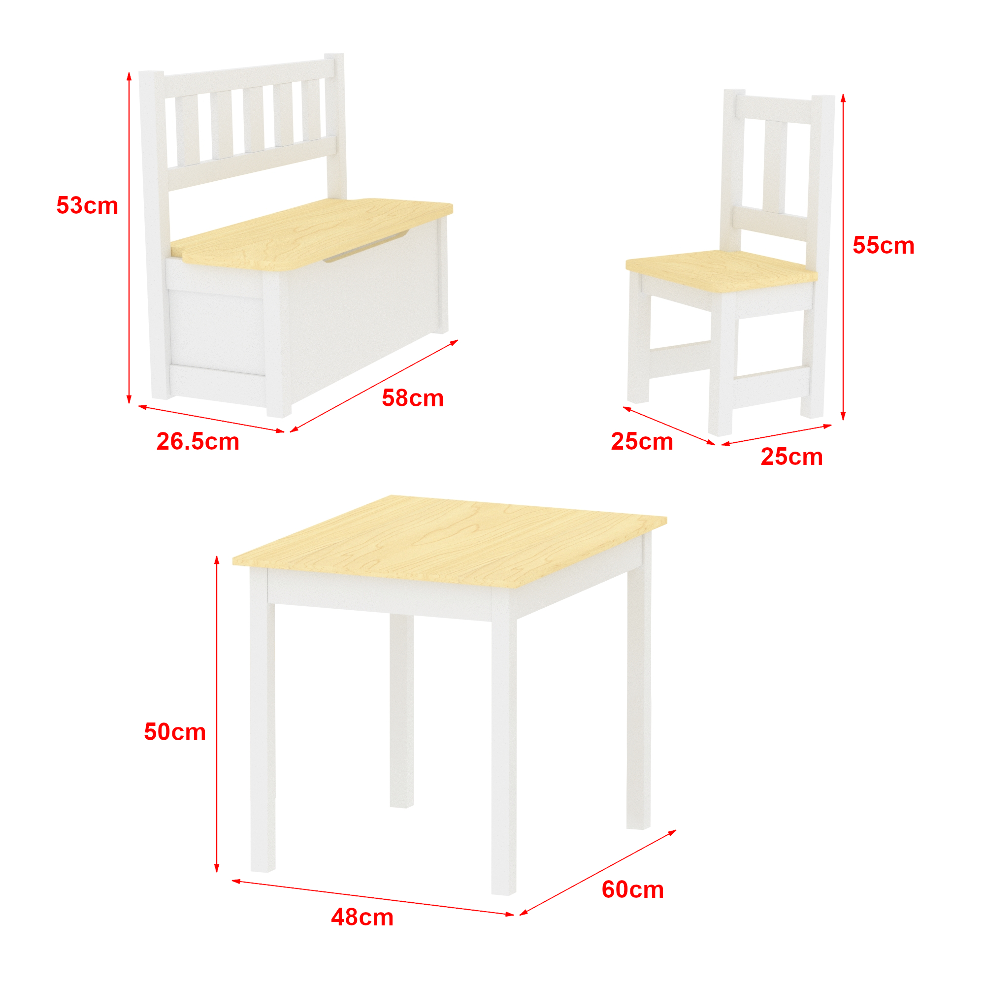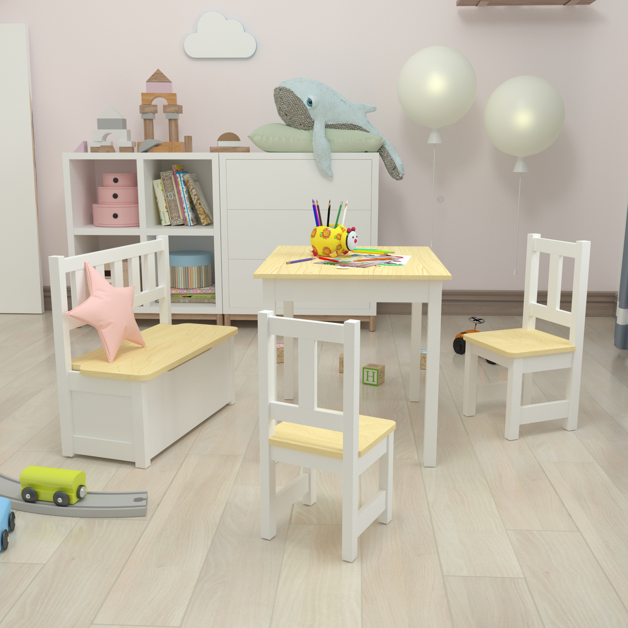 Der Tisch mit 2 Stühlen und einer Sitzbank eignet sich perfekt für jedes Kinderzimmer. Das Staufach unter der aufklappbaren Sitzfläche der Bank bietet eine Möglichkeit Spielzeuge platzsparend unterzubringen.