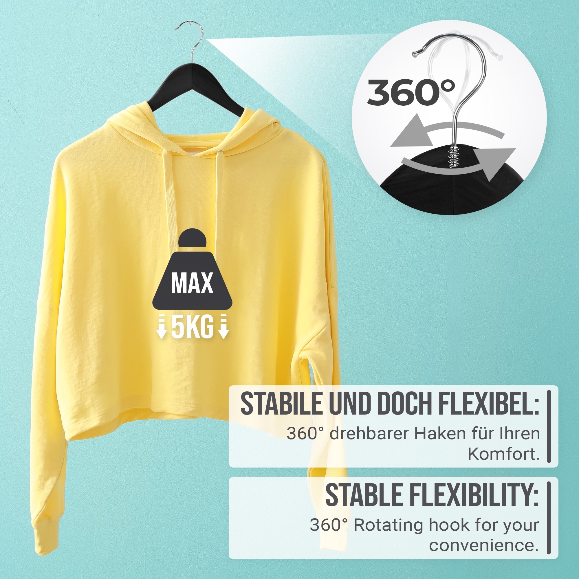 - Der drehbare Metallhaken sichert die flexible Ausrichtung