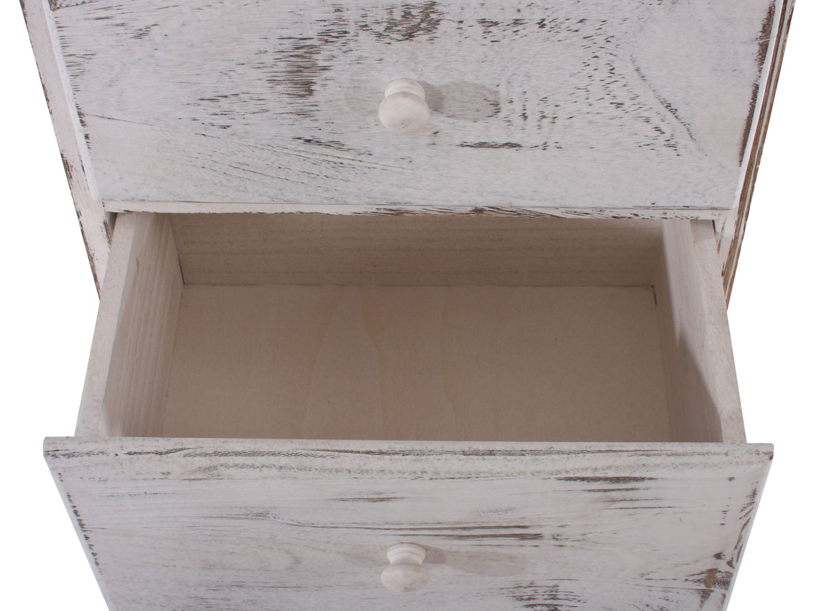 Die Seiten- und Rückenwände sind ebenfalls im charmanten Shabby-Look gehalten, was den Gesamtcharakter der Kommode stilvoll abrundet.