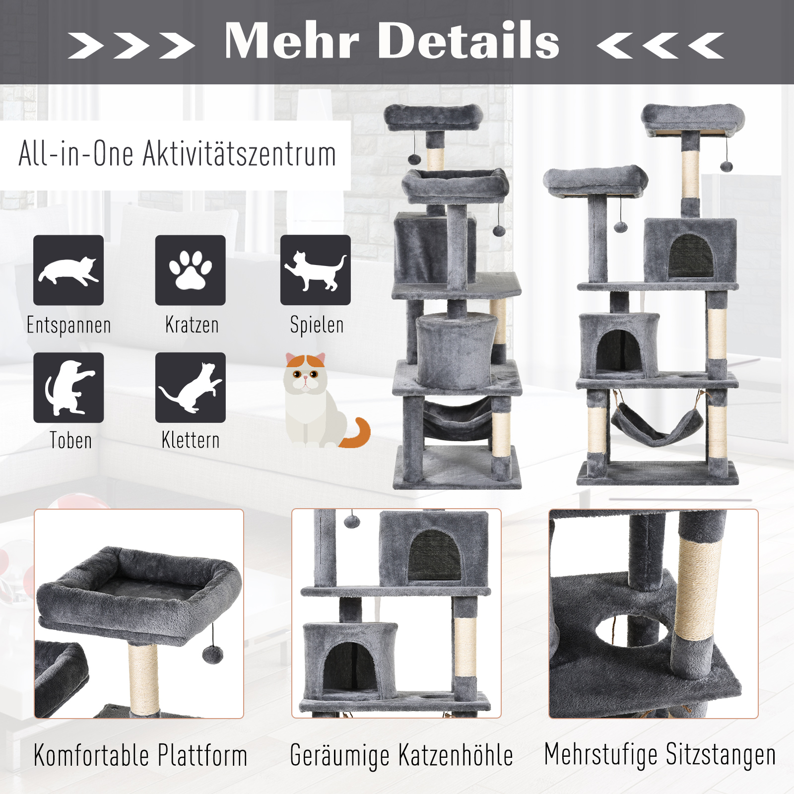 - Der Kratzbaum bietet als ideales Spielhaus genügend Platz auf mehreren Ebenen.