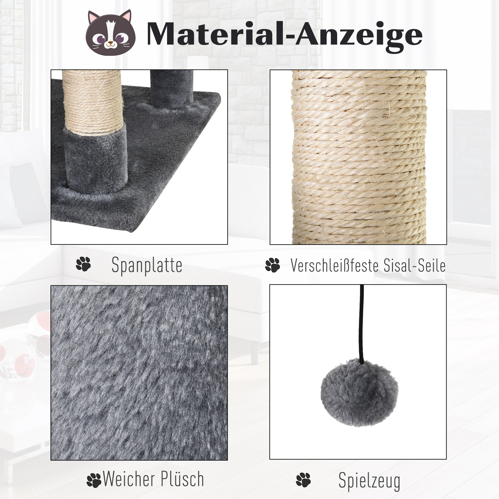 - Material: Spanplatten. Plüsch. Sisal