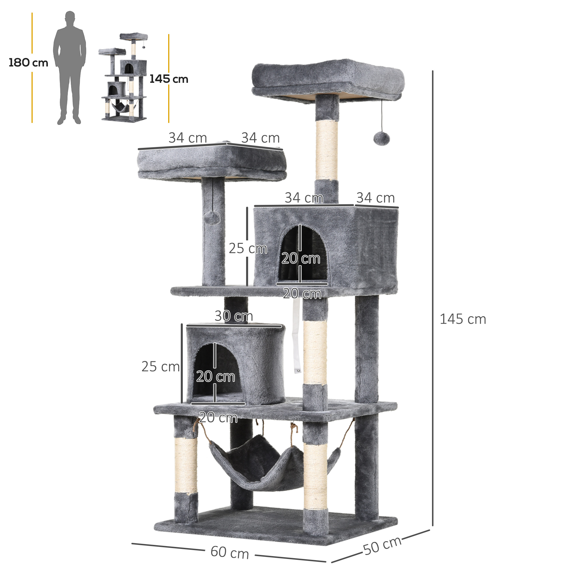 Unser Katzenbaum ist das ideale Entspannungsheim für Ihr geliebtes Haustier. Auf mehreren Etagen bietet er zahlreiche Möglichkeiten zum Spielen und Entdecken. Er verfügt über zwei Höhlen. die als Rückzugsorte dienen. und zwei Aussichtsplattformen. die Ihrer Katze stets den Überblick ermöglichen. Die mit Sisal umwickelten Pfosten geben Ihrem Tier Gelegenheit. die Krallen zu schärfen und schonen gleichzeitig Ihre Möbel. Die stabile Basis besteht aus natürlichen Spanplatten und ist mit weichem Plüsch bezogen. Ihre Katze wird diese Katzenmöbel lieben!