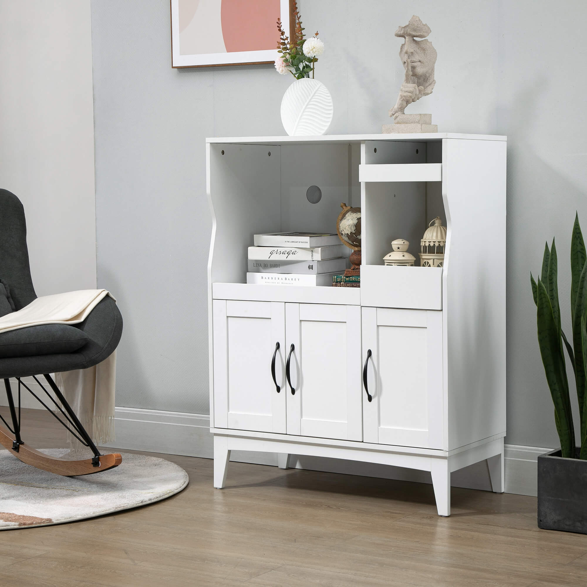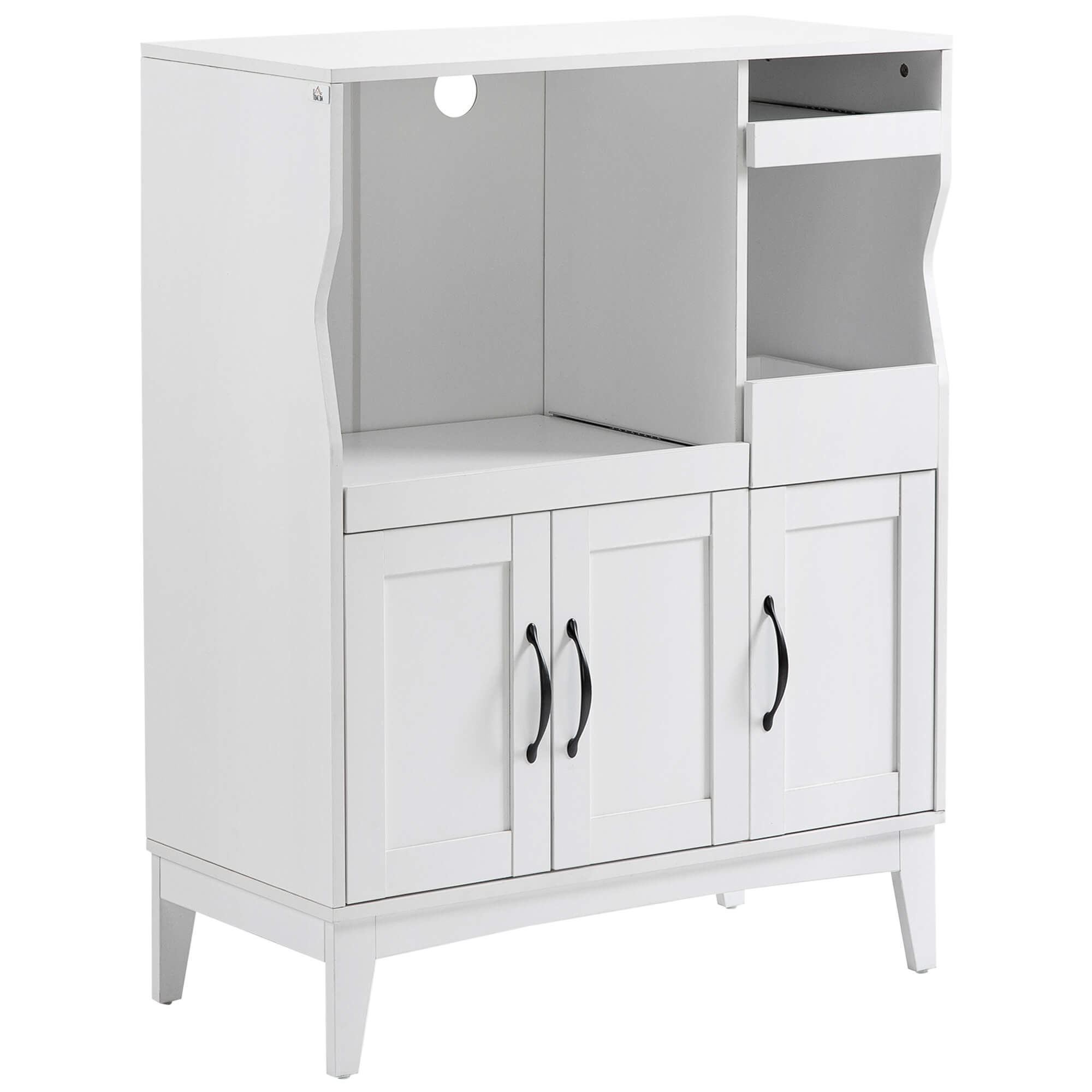Dieser moderne Küchenschrank ist ein Muss für jeden kleinen Küchenbereich. Es verfügt über 2 praktische Schubladen und 2 geschlossene Schränke zur Aufbewahrung von Alltagsgegenständen, Utensilien, Trockenwaren sowie Tellern und Geschirr. Das große offene Fach ist geeignet für Kaffeemaschinen, Mixer, Pürierstab, Toaster und vieles mehr. Mit ausziehbarem Tablett zum einfachen Verschieben der Küchengeräte für eine bequeme Handhabung.