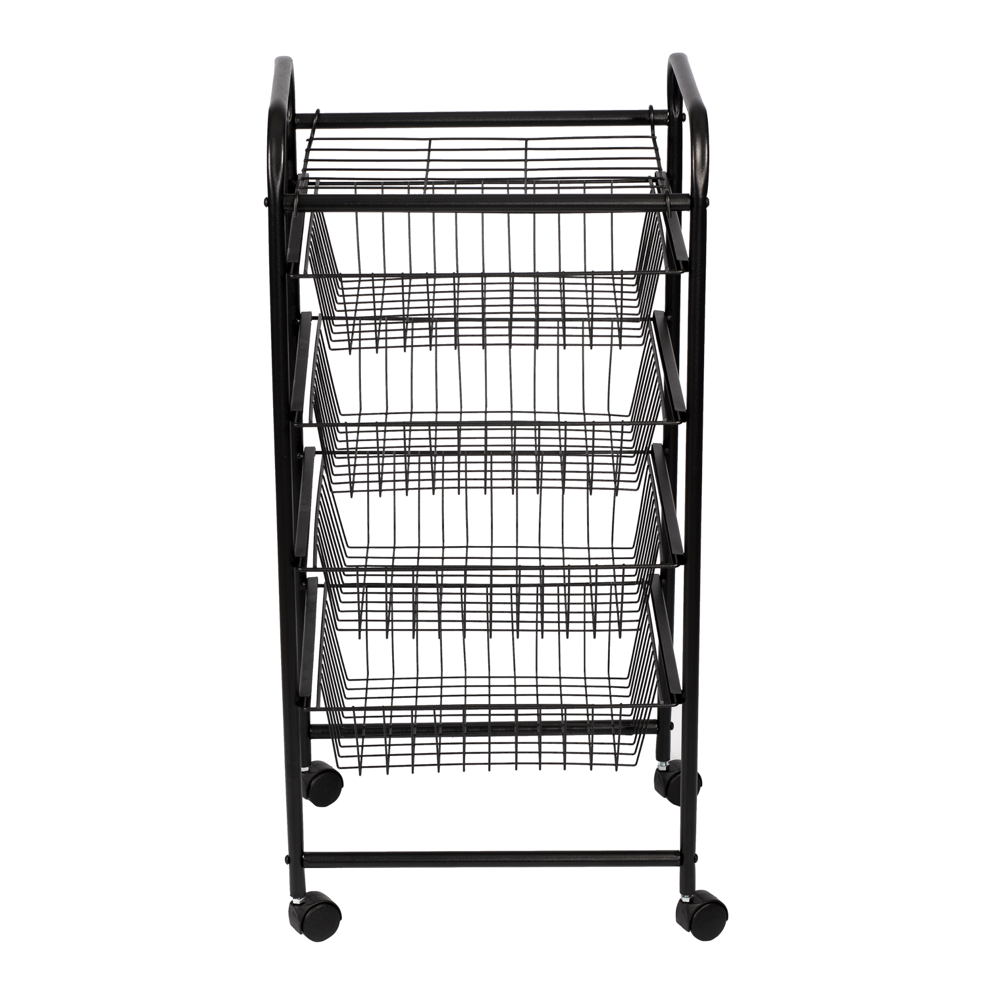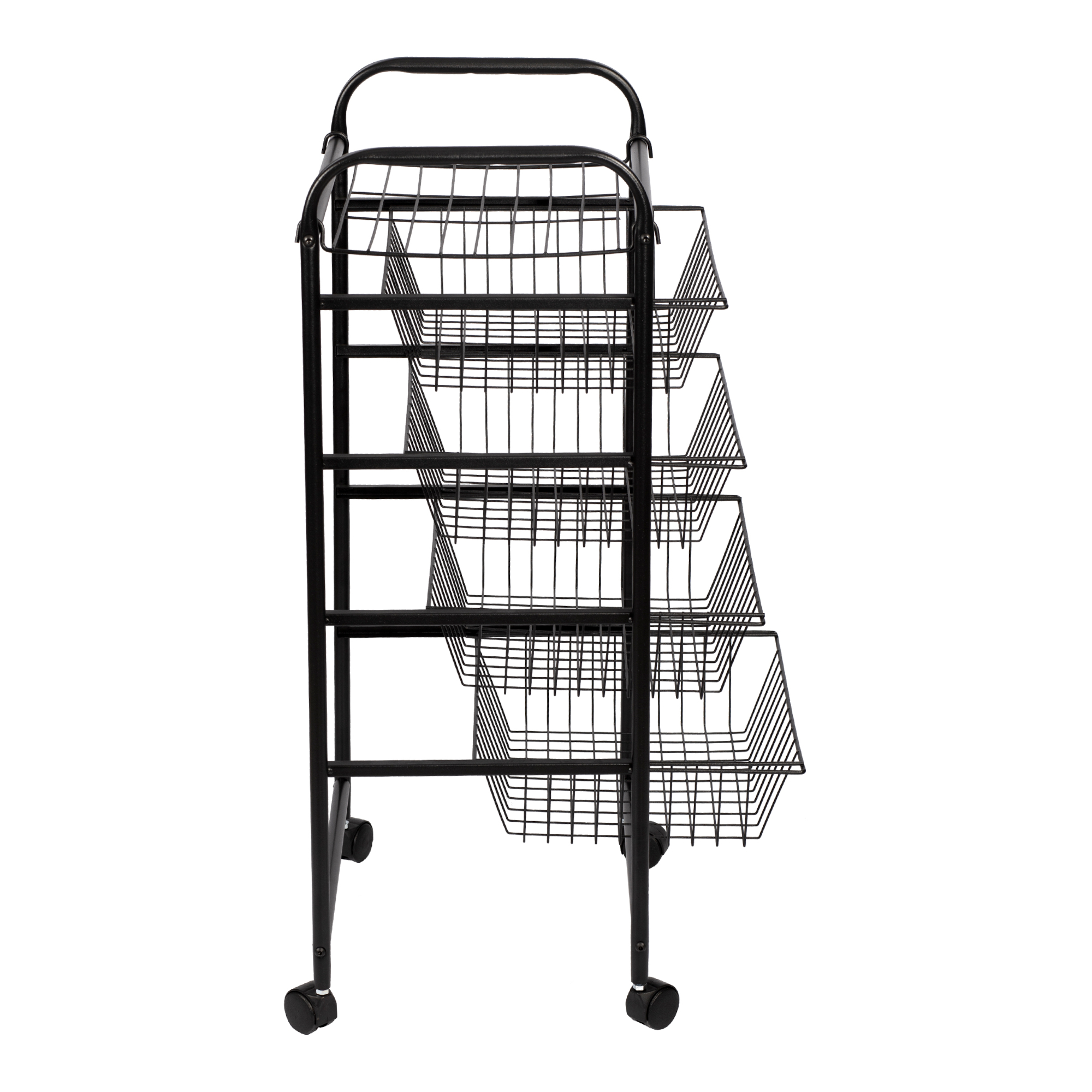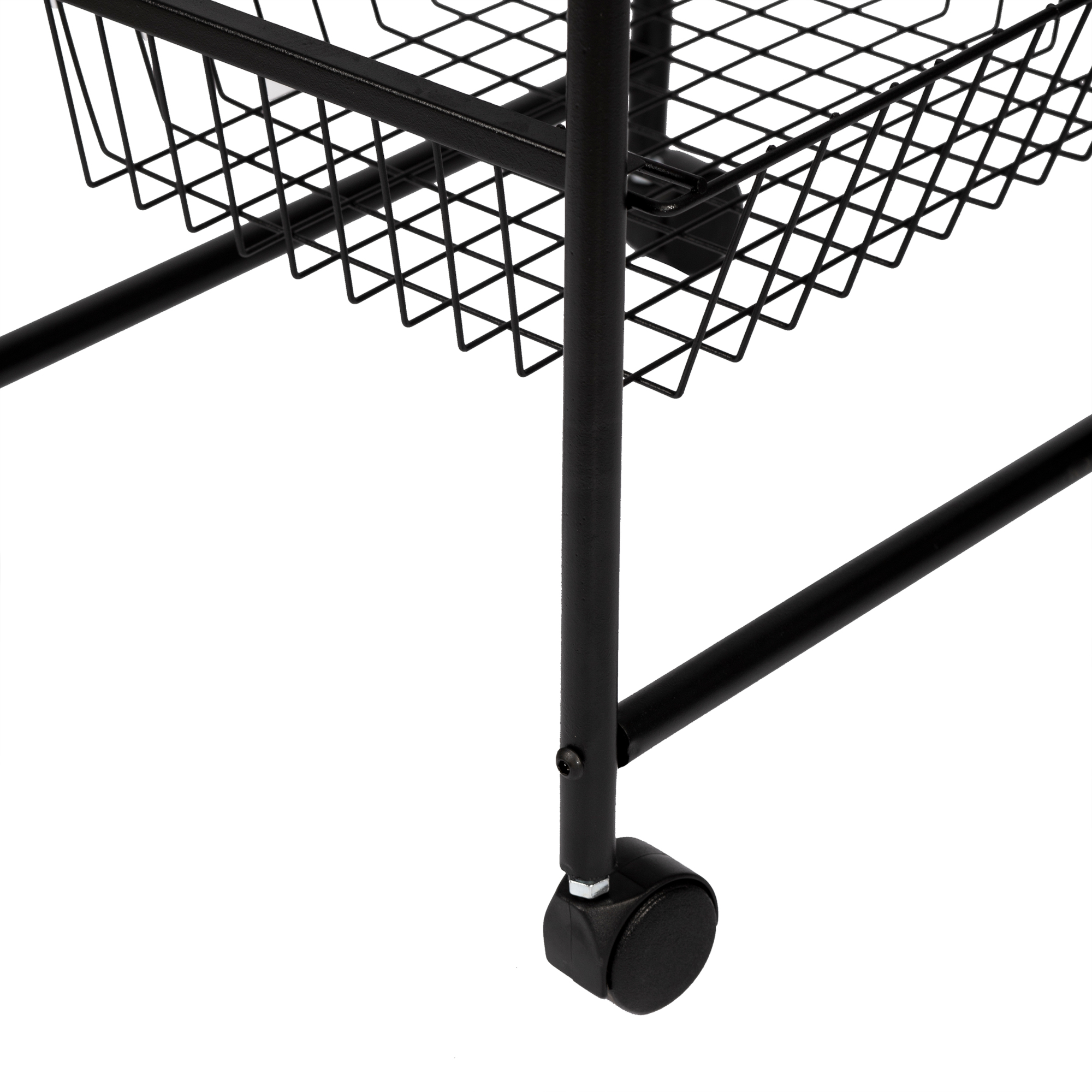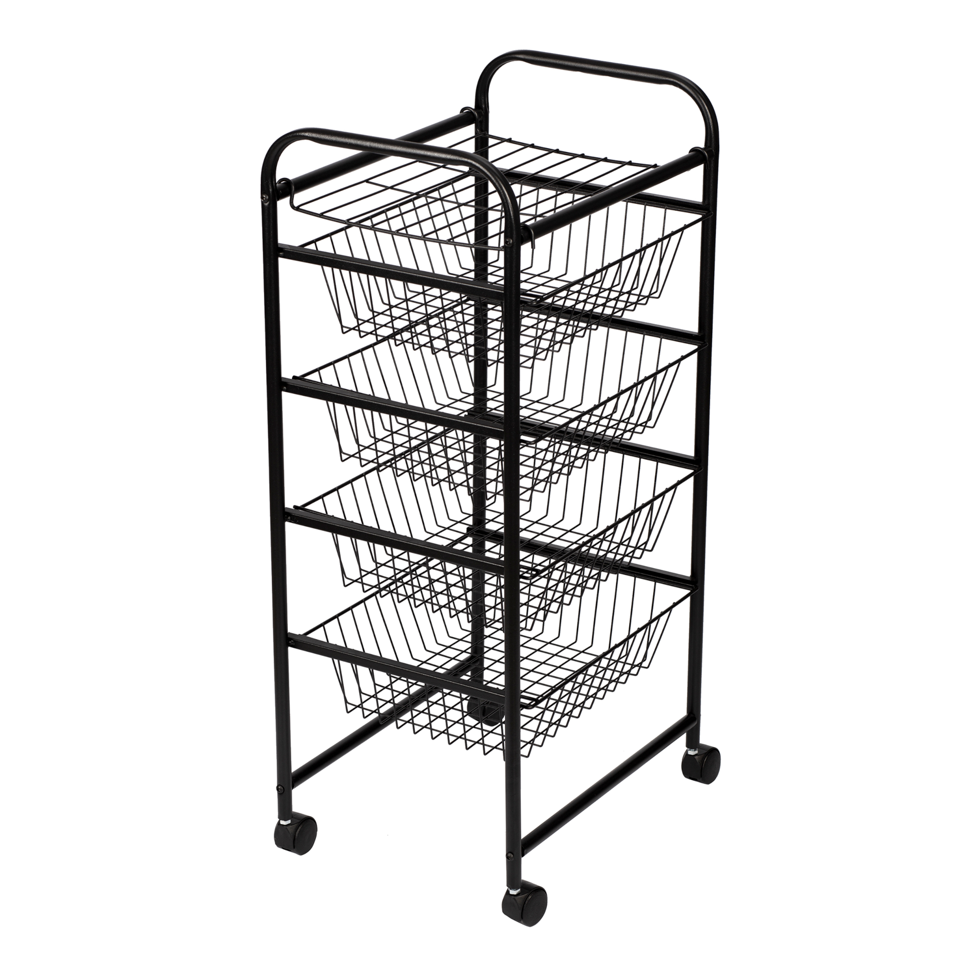 Das praktische Allzweckregal kann durch die 4 Rollen schnell und einfach verschoben werden. Die vier Ablagekörbe und die obere Gitterablage sorgen für eine sortierte Aufbewahrung.