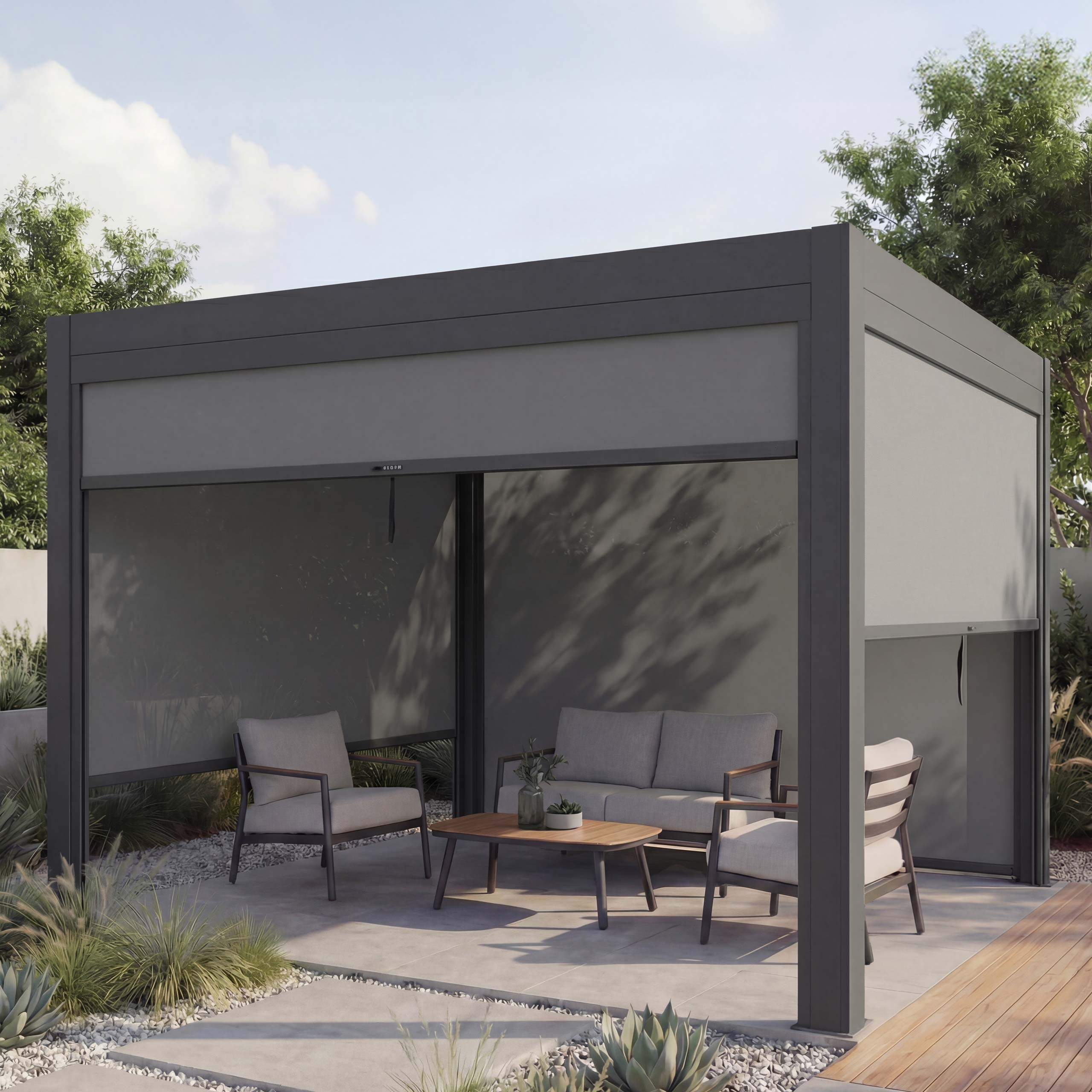 Moderne Pergola mit Lamellendach und Seitenwänden – Ihr stilvoller Sonnenschutz für Garten und Terrasse