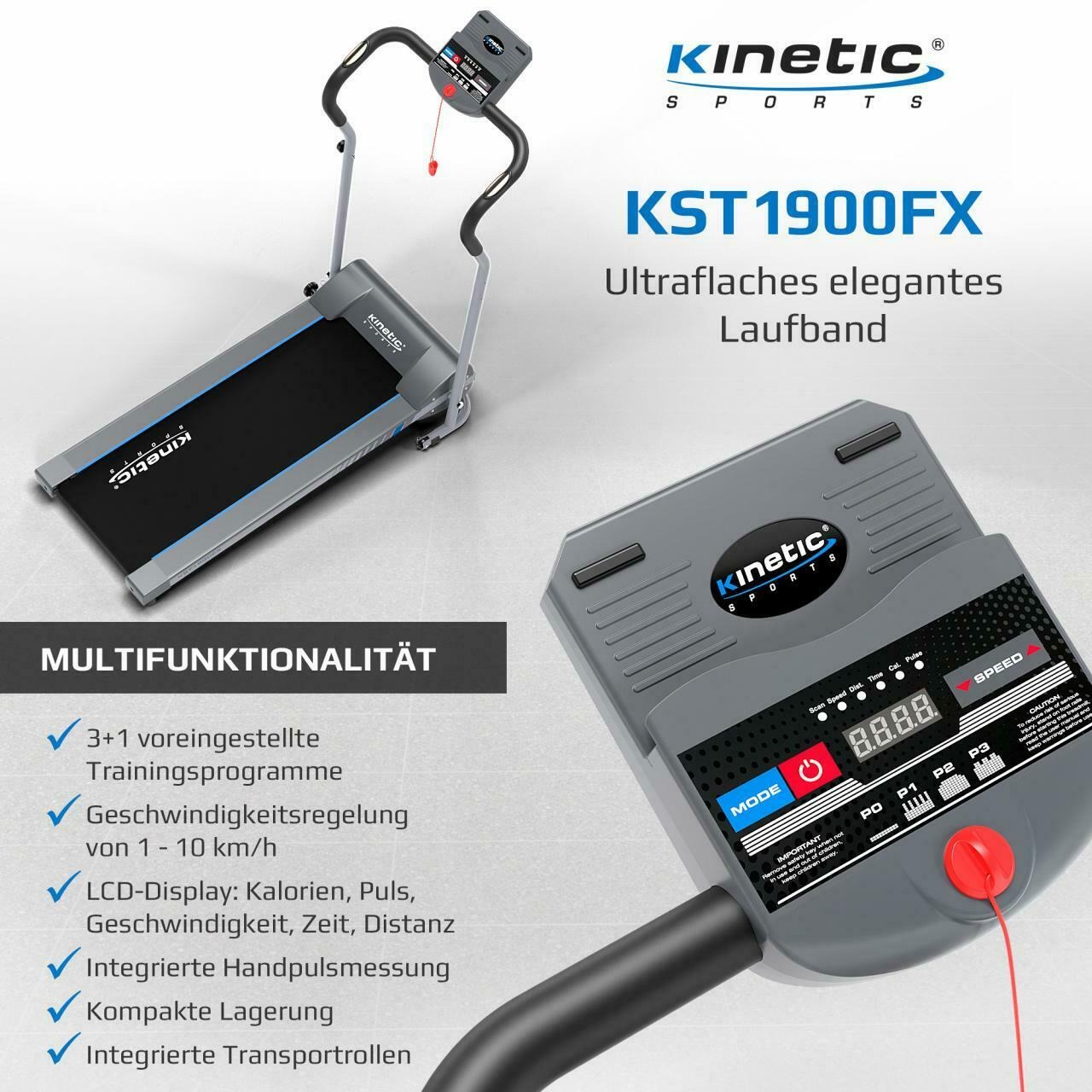 Das Kinetic Sports Laufband ist das perfekte Laufband für Einstieger und Fortgeschrittene. Der Trainingscomputer zeigt Kalorien, Puls, Geschwindigkeit, Zeit und Distanz an und ermöglicht so ein gezieltes Workout. Das Laufband mit dem leisen Elektromotor ermöglicht es Ihnen zu trainieren, wann und wo Sie wollen. Dank des Klappmechanismus kann das Laufband nach dem Training einfach und leicht verstaut werden.