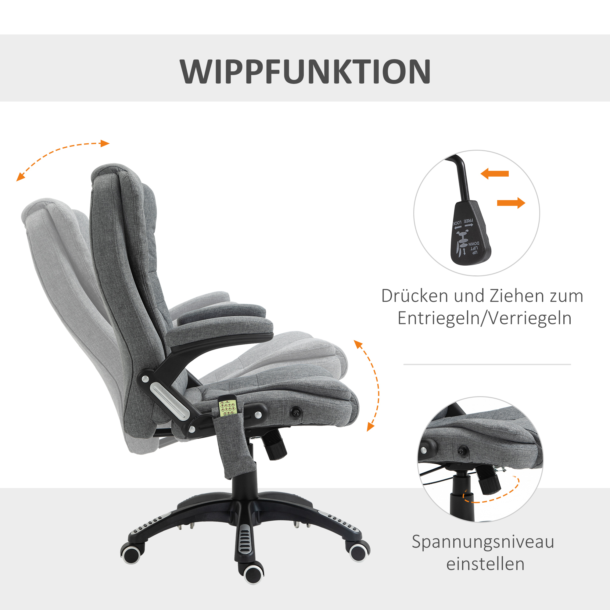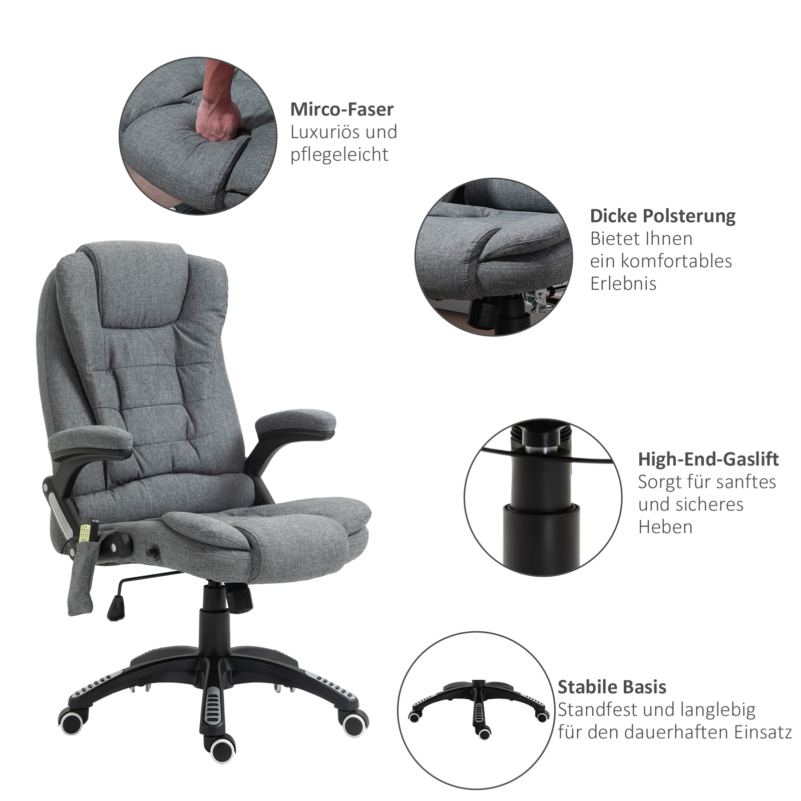 Dieser Chefsessel bietet nicht nur einen bequemen Platz zum Sitzen, sondern sorgt mit Massagefunktion und Heizelementen für die ultimative Entspannung. Machen Sie es sich auf dem weich gepolsterten Sitz gemütlich, lehnen Sie sich dank der verstellbaren Rückenlehne auf bis zu 130° zurück und steuern Sie die Massage ganz bequem per Fernbedienung. Der atmungsaktive Flanell-Bezug sorgt für angenehmes Sitzen bei jeder Temperatur.