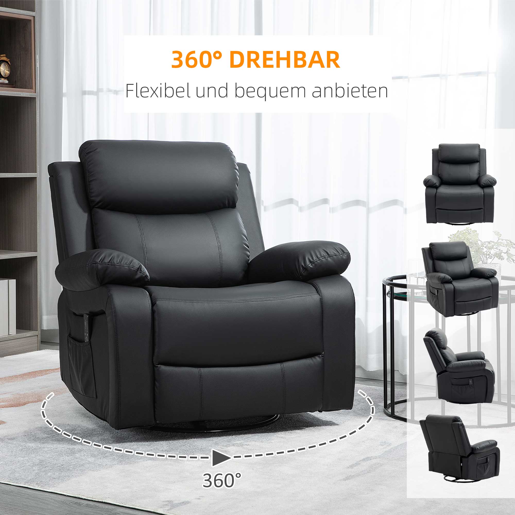 Tauchen Sie mit Ihrem persönlichen weichen Relaxsessel mit Massagefunktion in die Welt des Komforts! Unser fantastischer Massagesessel wird Ihnen ein ultra gemütliches Erlebnis bieten. Mit einer 360-Grad-Drehfunktion kann dieser Sessel in jede Richtung gedreht werden. Es gibt 8 Vibrationspunkte für eine Massage der Taille, der Oberschenkel und der Waden. Die Massagefunktion kann über eine Fernbedienung gesteuert werden.