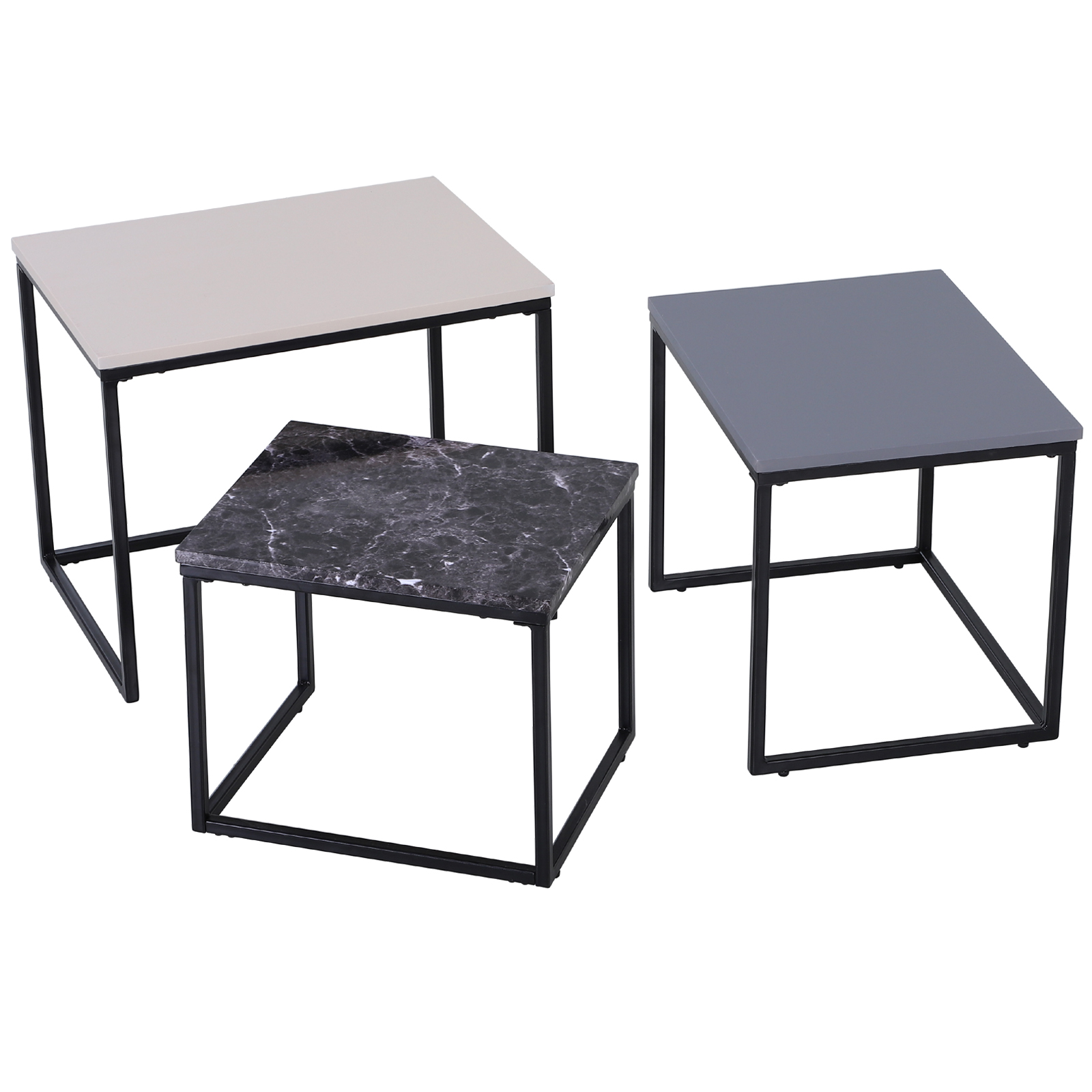 Sie brauchen mal mehr, mal weniger Abstellfläche vor Ihrem Sofa? Für solche Gelegenheiten ist dieses Set aus drei kleinen Couchtischen der Marke gemacht. Sie können alle drei platzsparend übereinanderschieben, sie zu einem Ensemble arrangieren oder ganz separat im Raum verteilen. Die Tische sind aus hochwertiger MDF-Platte mit PVC-Laminat in Weiß, Grau und scharzem Marmorimitat beschichtet. Das macht die Couchtische wasserabweisend und strapazierfähig. Die MDF-Platten ruhen auf einem robusten schwarzen Metallgestell.