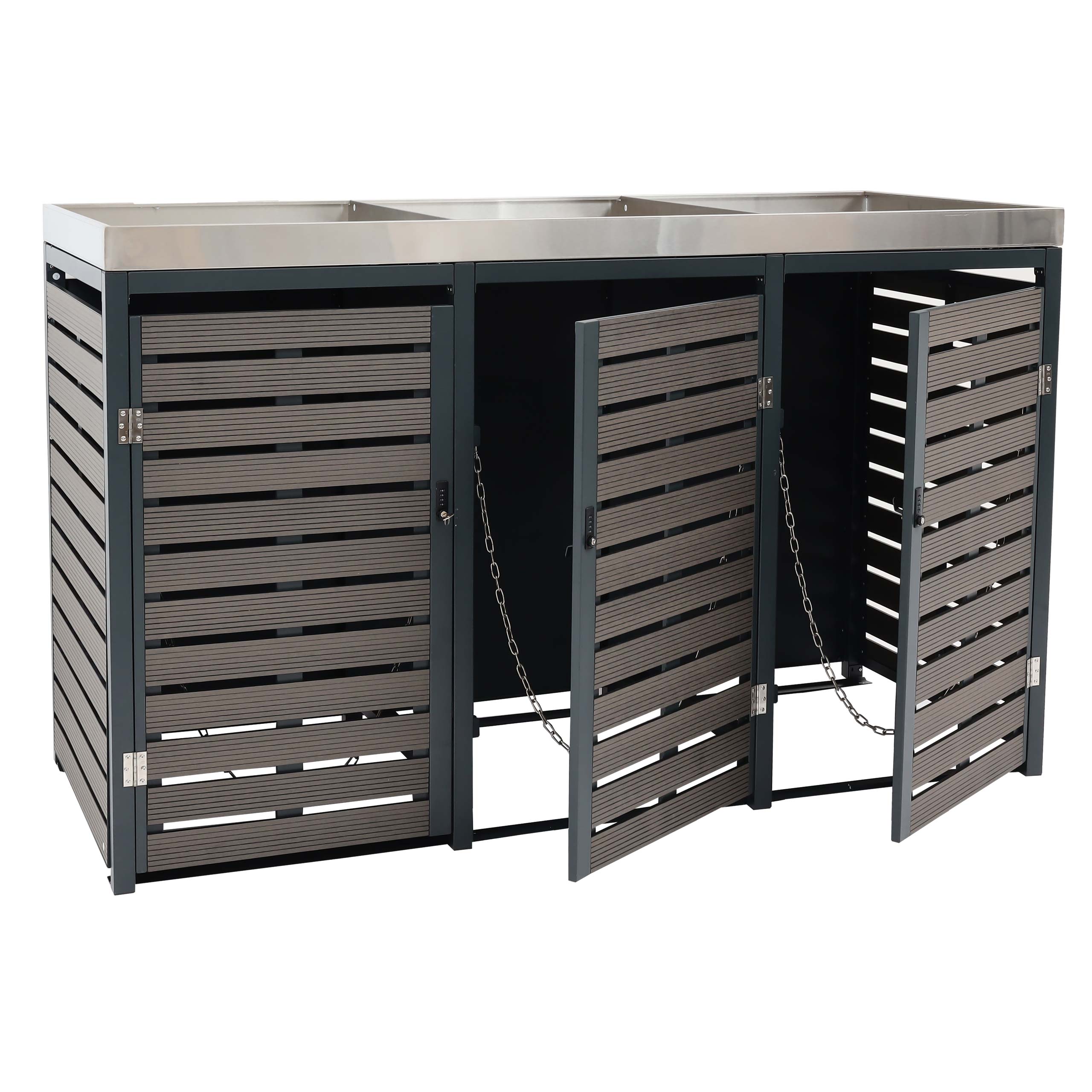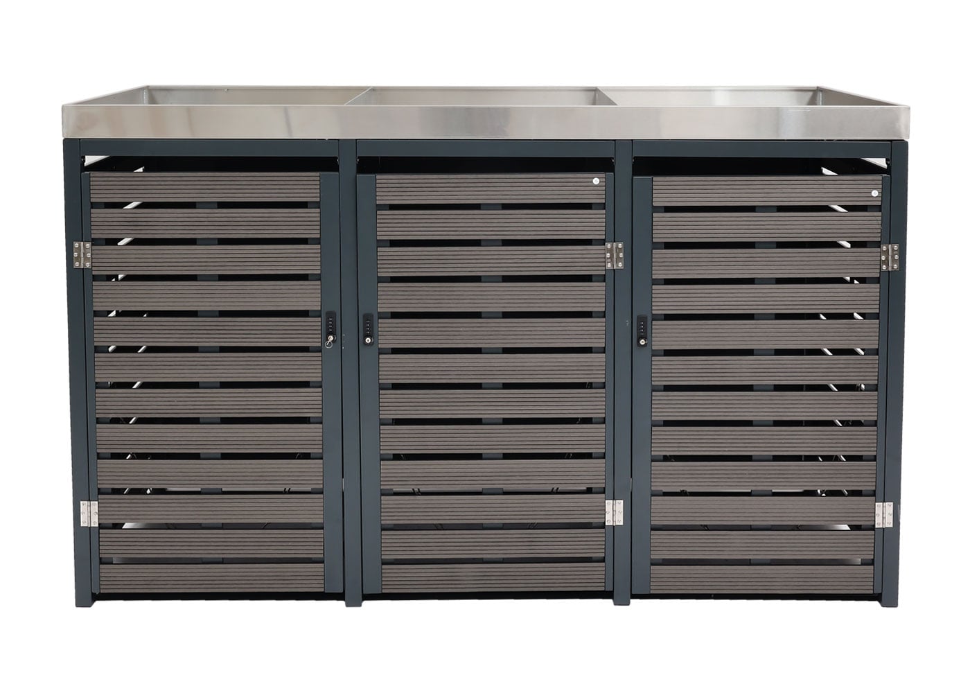 Mülltonnenverkleidung mit Pflanzkasten – für 3 Tonnen. abschließbar. WPC/Edelstahl