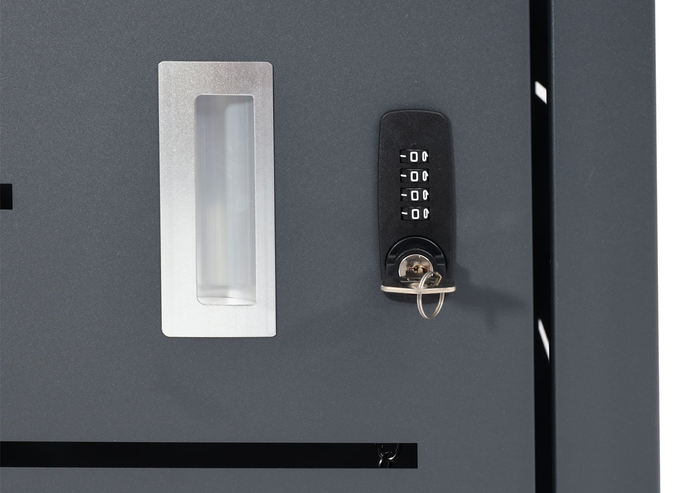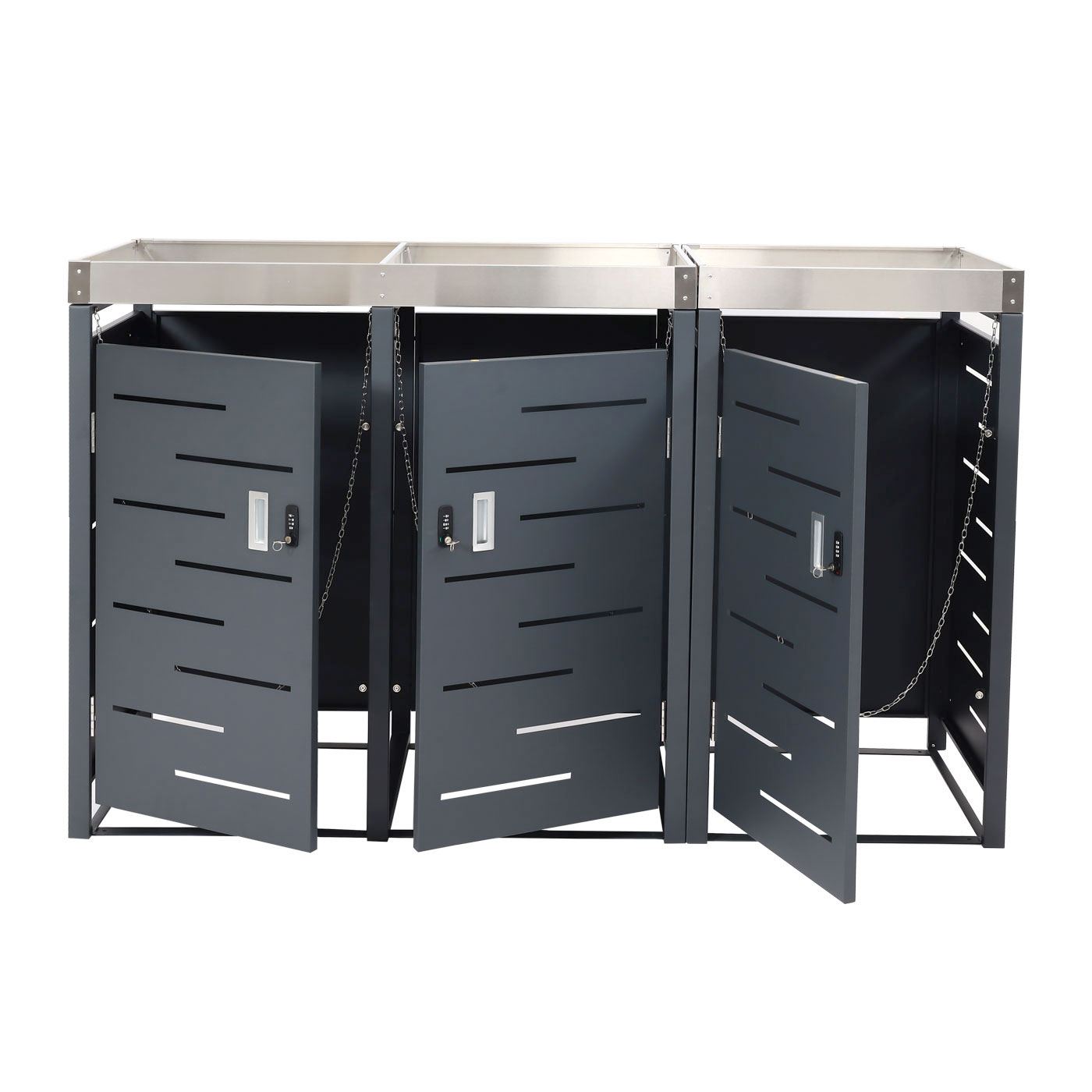 - Jede Tür einzeln abschließbar: Schloss (Schlüssel) und Zahlenschloss (individuell einstellbarer 4-stelliger Code)
