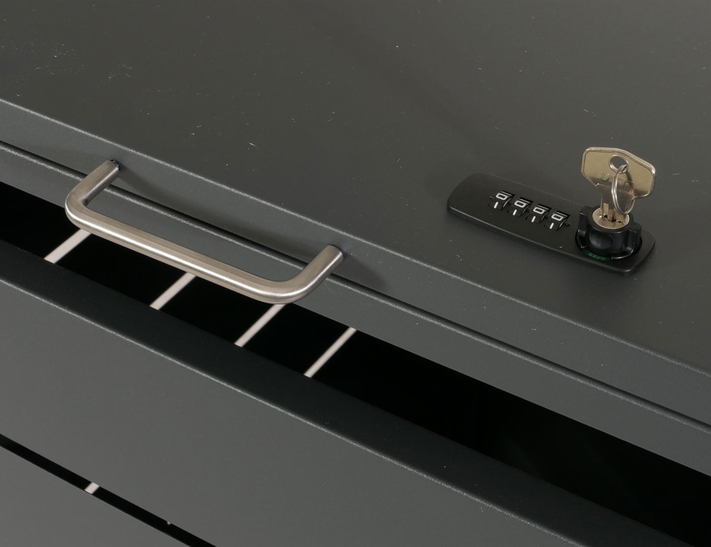 - Deckel und Türen getrennt abschließbar (Schlüssel und Zahlenschloss mit 4-stelligem Code)