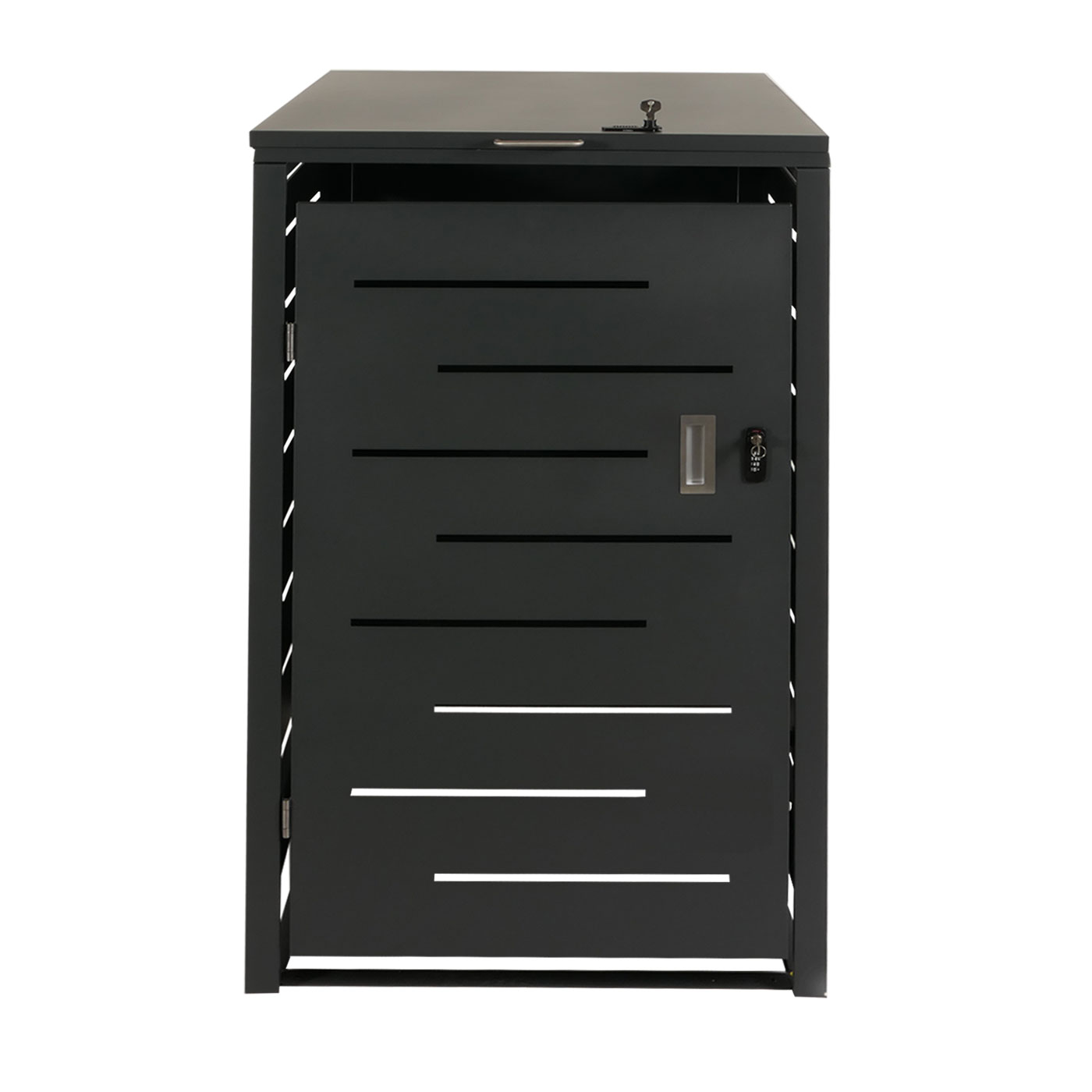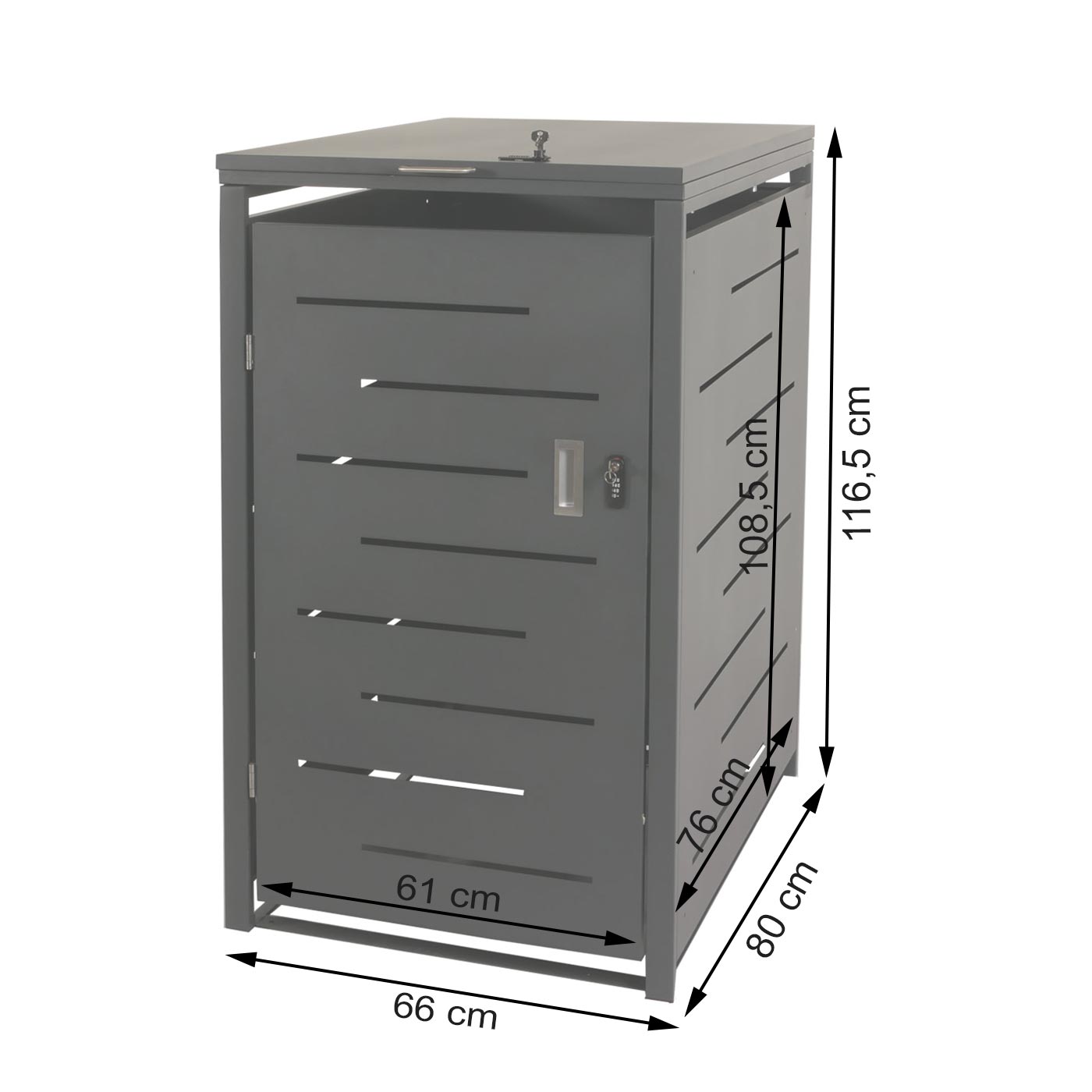 - Deckel und Tür getrennt abschließbar (jeweils Schloss und Zahlenschloss mit individuellem 4-stelligem Code)