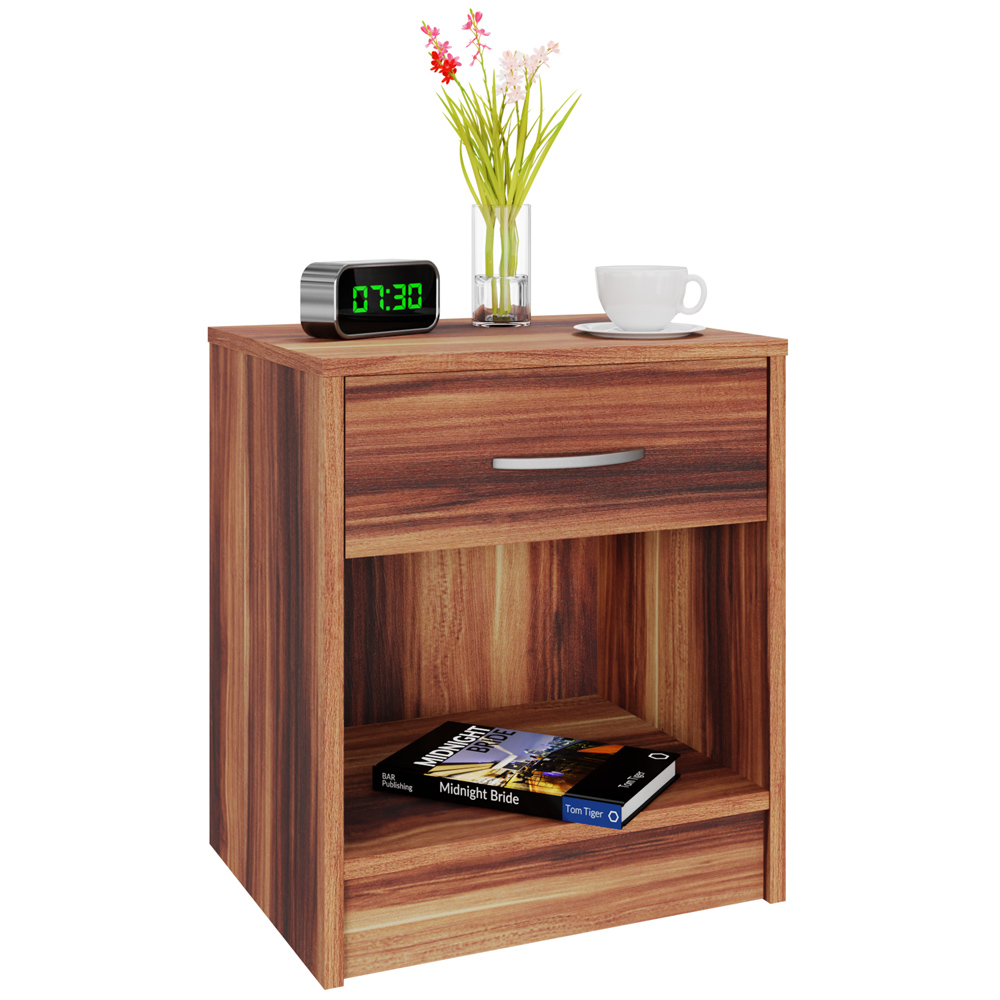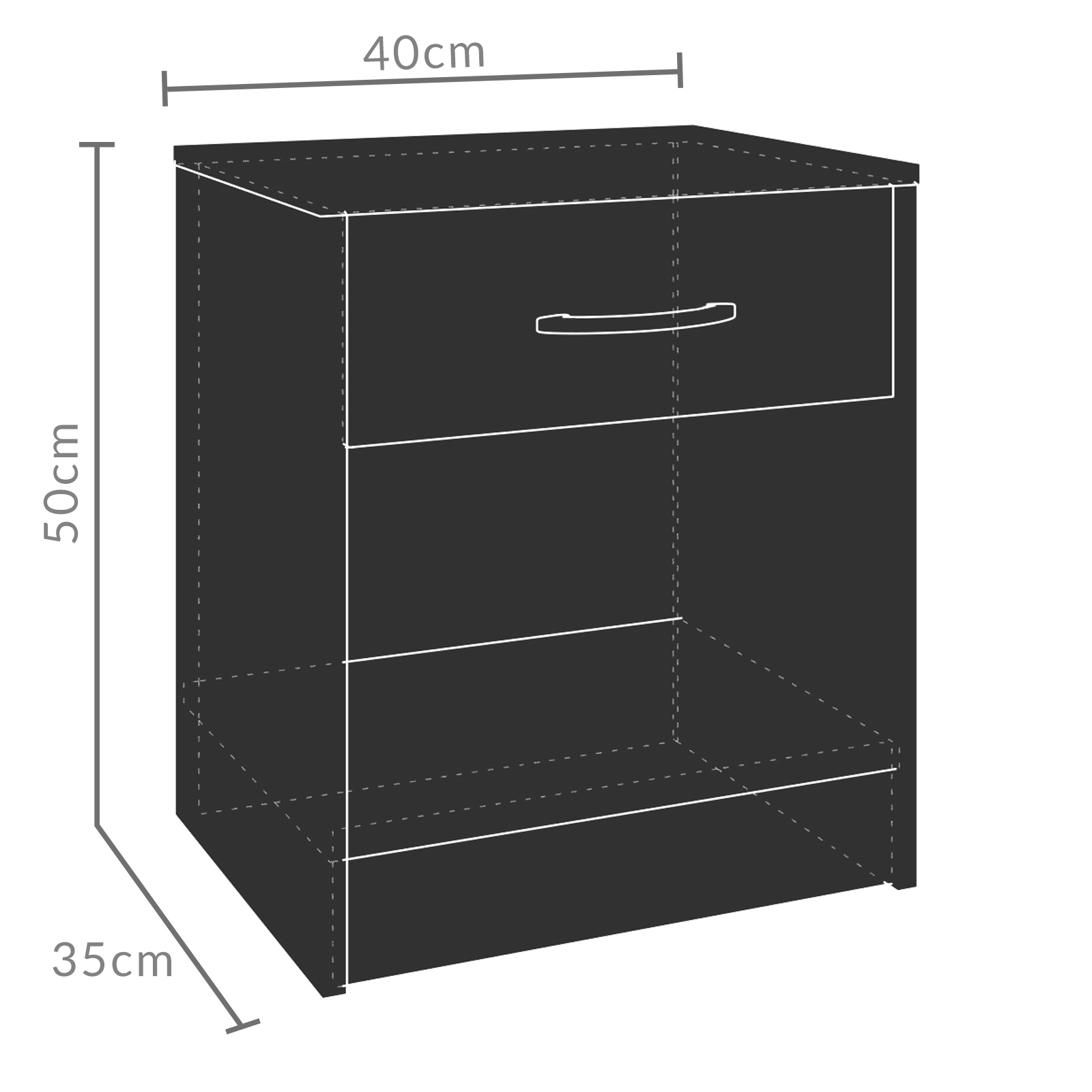 Aufgrund des kompakten Maßes (HxBxT) 50cm x 40cm x 35cm benötigt er nicht viel Platz, bietet aber durch die Ablageflächen und der leichtgängigen Schublade mit chromfarbenem Griff ausreichend Stauraum für Ihren Wecker, Ihr Lieblingsbuch oder andere persönlichen Dinge.