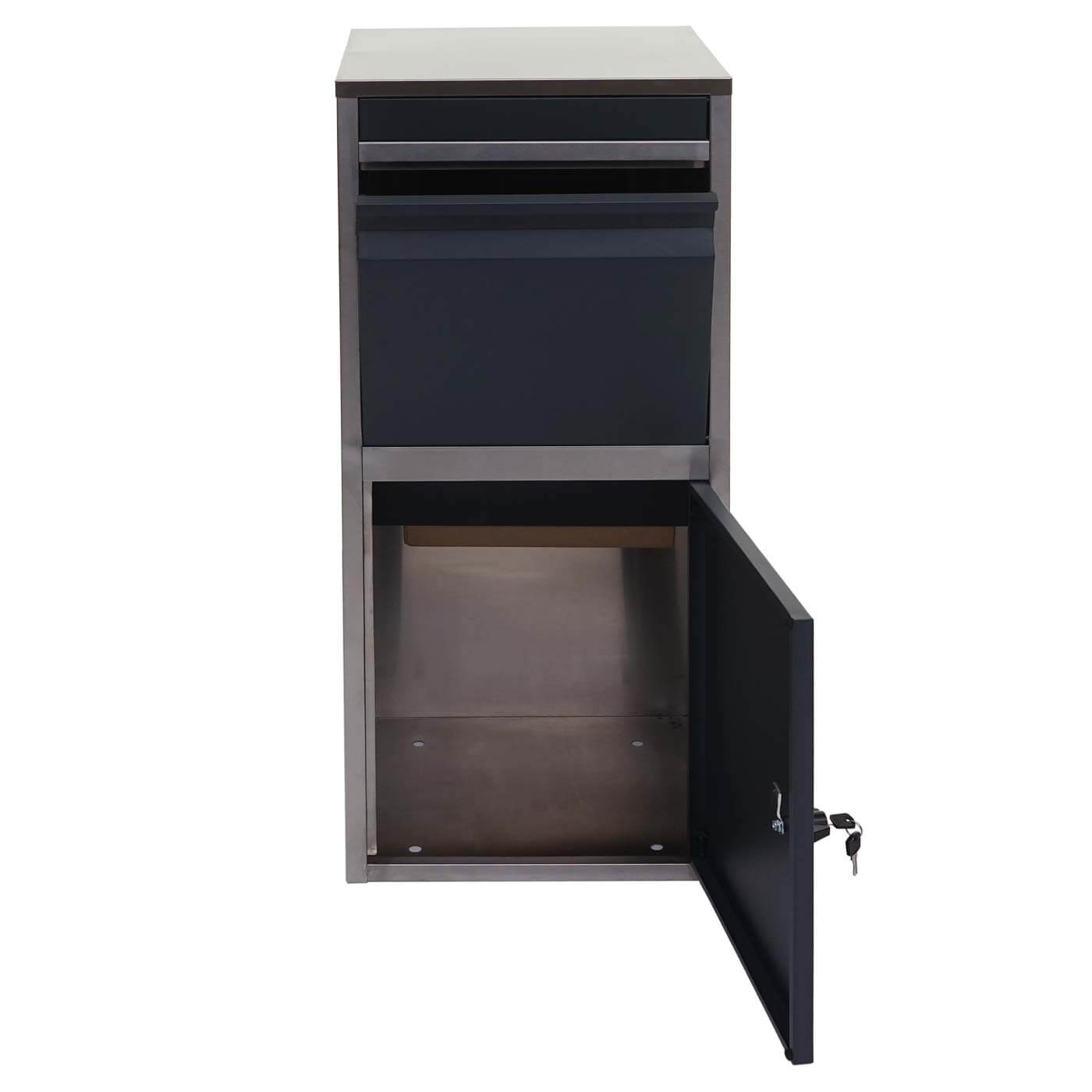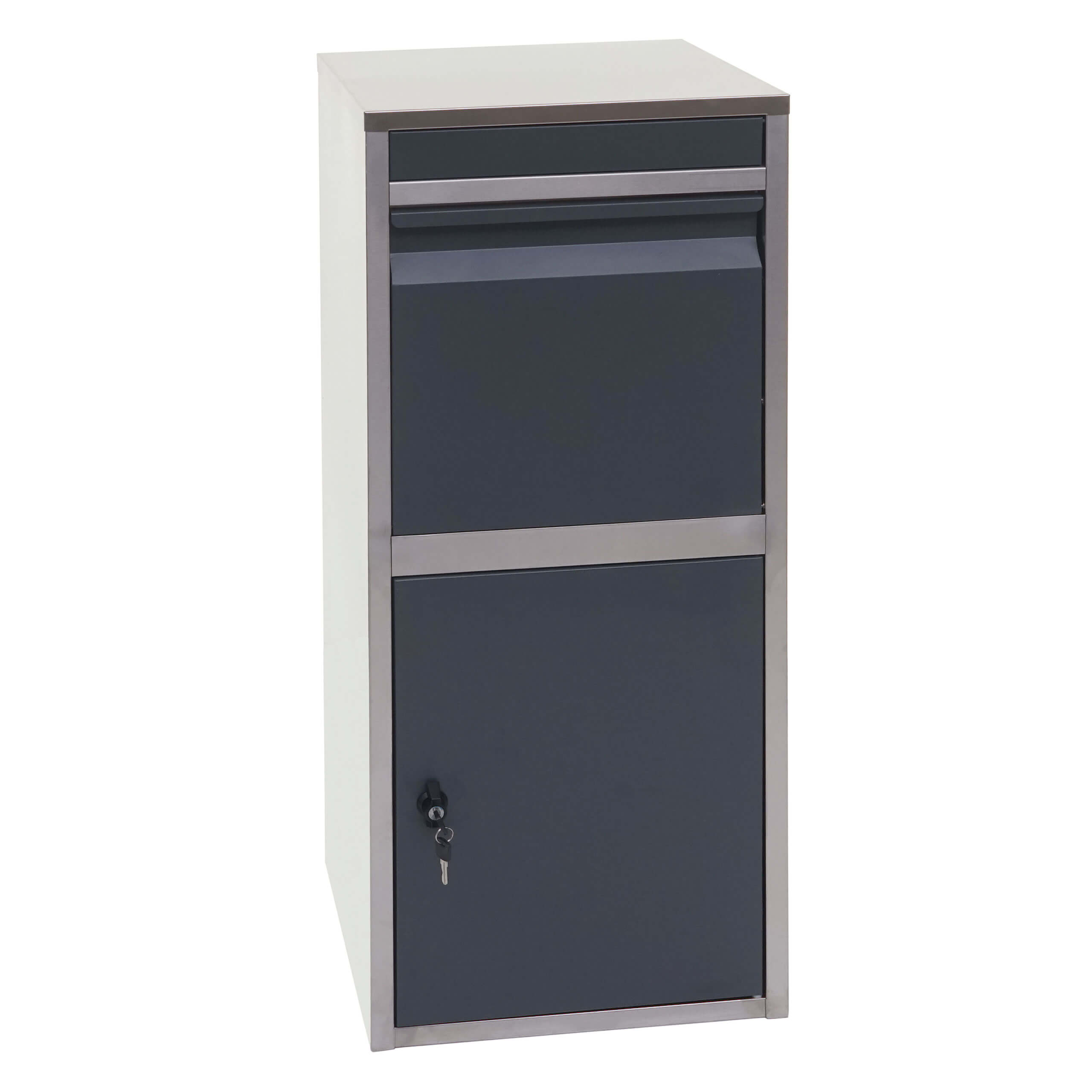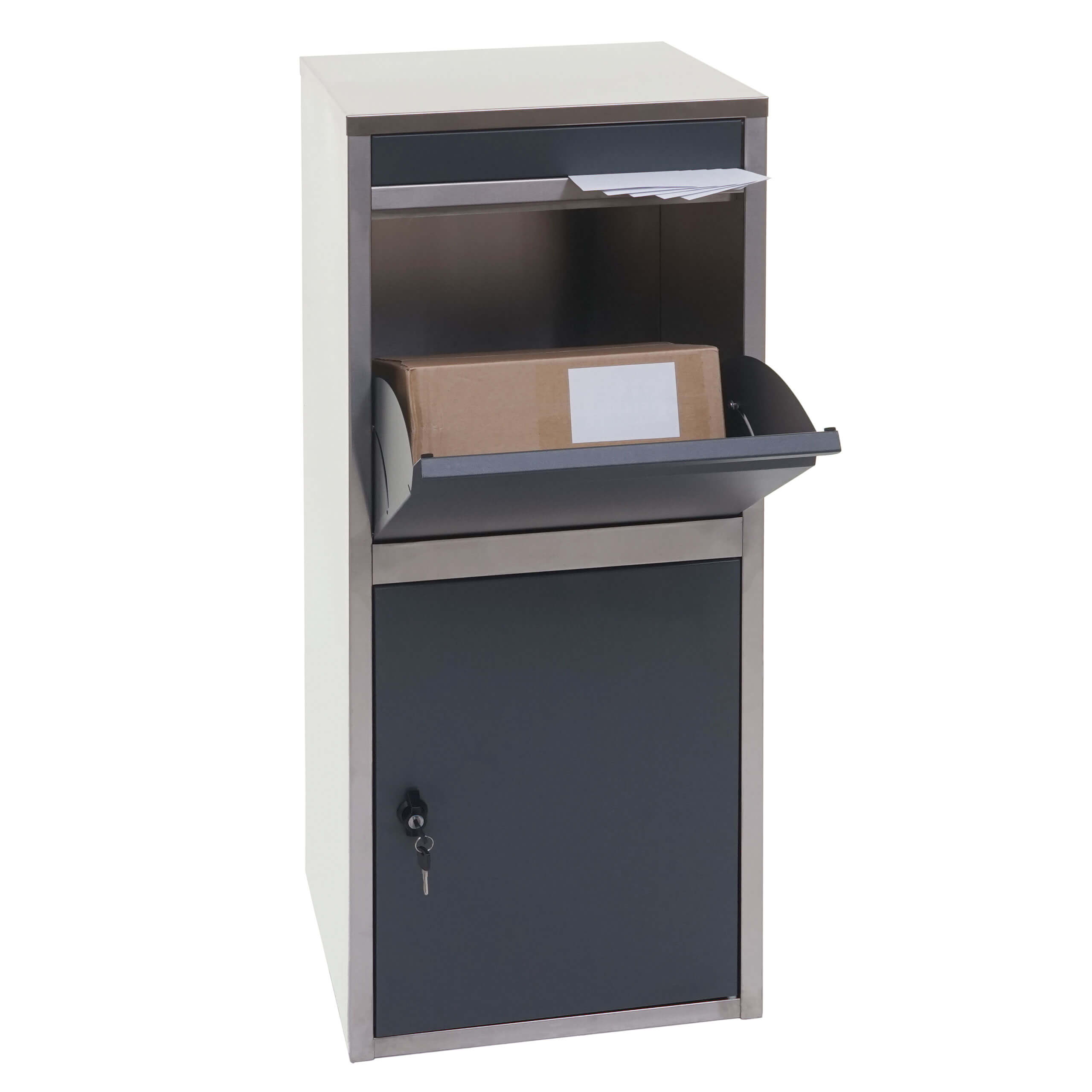 Dank des großen Einwurfs bietet der Paketbriefkasten Kapazität für viel Post – perfekt, wenn Sie auch mal länger weg sind. Diese schicke Paketbox ist sowohl für den Einwurf von Briefen, als auch für die Annahme von kleinen bis mittleren Päckchen bis zu einer Größe von 36,5×33,5×25 cm geeignet. Zudem verfügt der Standbriefkasten ein durchdachtes Einwurfsystem: Die Einwurfklappe wird geöffnet und das Päckchen hineingelegt. Sobald die Klappe geschlossen wird, fällt das Päckchen in den unteren Bereich der Paketbox, wo es zusammen mit den normalen Briefen entnommen werden kann. Selbstverständlich ist der untere Teil der Box abschließbar, sodass kein Unbefugter an Ihre Sendungen herankommen kann. Zusätzlich haben Sie auch die Möglichkeit, mit dem mitgelieferten Befestigungsmaterial die Box sicher am Boden zu verschrauben. In der Bodenplatte befinden sich vorgebohrte Montagelöcher.