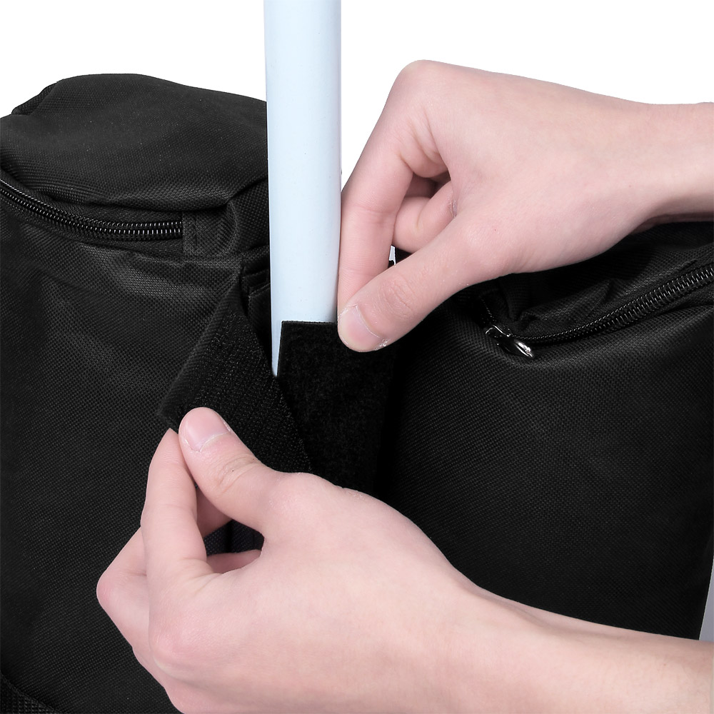 Das Pavillon Gewichte Set gibt Ihrem Pavillon eine optimale Standfestigkeit. Die Säcke lassen sich einfach mit Sand befüllen und per Reißverschluss sicher verschließen. Mittels der Klettverbindung und dem zusätzlichen Zurgurt, lassen sich die Säcke an allen Standfüßen befestigen.