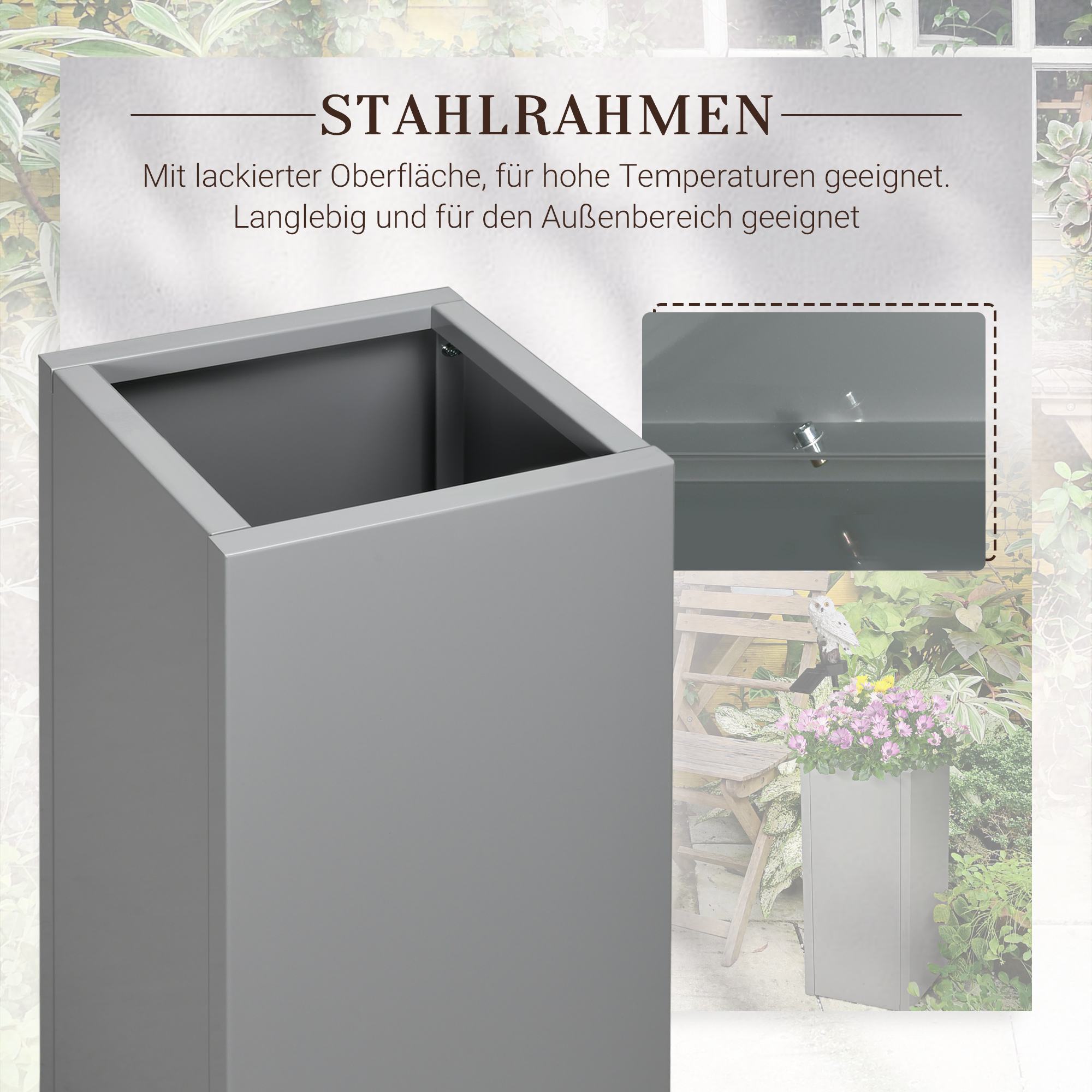 Dieser Pflanzkübel von Outsunny ist eine schöne Art, ihren Garten zu verschönern. Er bietet Blumen, Pflanzen und Gemüsepflanzen viel Platz zum Wachsen. Hergestellt aus behandeltem, lackiertem Stahl eignet er sich bestens für langfristigen Einsatz im Freien. Pflanzkübel halten Unkraut von Ihren Pflanzen fern, sorgen für eine gute Drainage und dienen der Schädlingsabwehr. Zudem ist dieser Pflanzkübel eine großartige Möglichkeit, ihren Außenbereich zu begrünen.