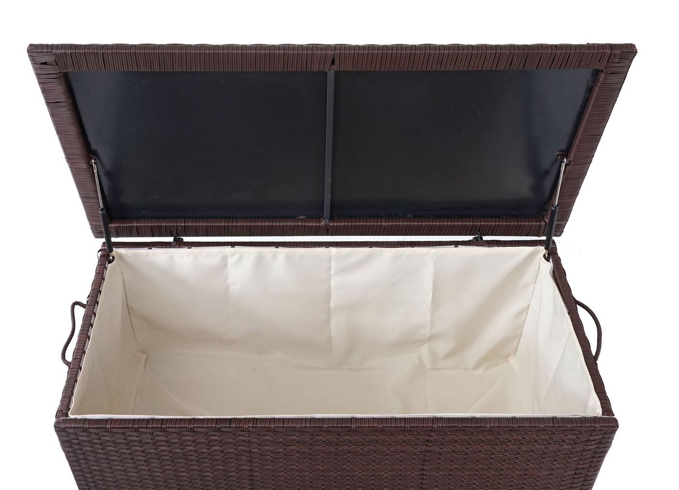 Im Innenraum befindet sich ein wasserabweisender Bezug, der sich mittels Klettband bei Bedarf schnell entfernen lässt. Für mehr Stabilität ist der Deckel mit einer PVC-Einlage verstärkt, so dass man diese Truhe auch sehr gut als Ablage nutzen kann. Der Innenbezug ist wasserabweisend, jedoch nicht wasserfest. D.h. mit der Zeit dringt wie bei allen uns bekannten Poly-Rattan-Boxen Feuchtigkeit ein. Wir empfehlen Ihnen daher die Aufstellung an einem regensicheren Platz. Durch zwei Rollen an einer Seite lässt sich die Truhe ganz einfach verschieben, setzt man sie ab, hat die Truhe durch die Füße auf der anderen Seite einen sicheren Stand. Mittels der Griffe auf beiden Seiten ist die Poly-Rattan Truhe in unbefülltem Zustand auch ganz leicht zu tragen.