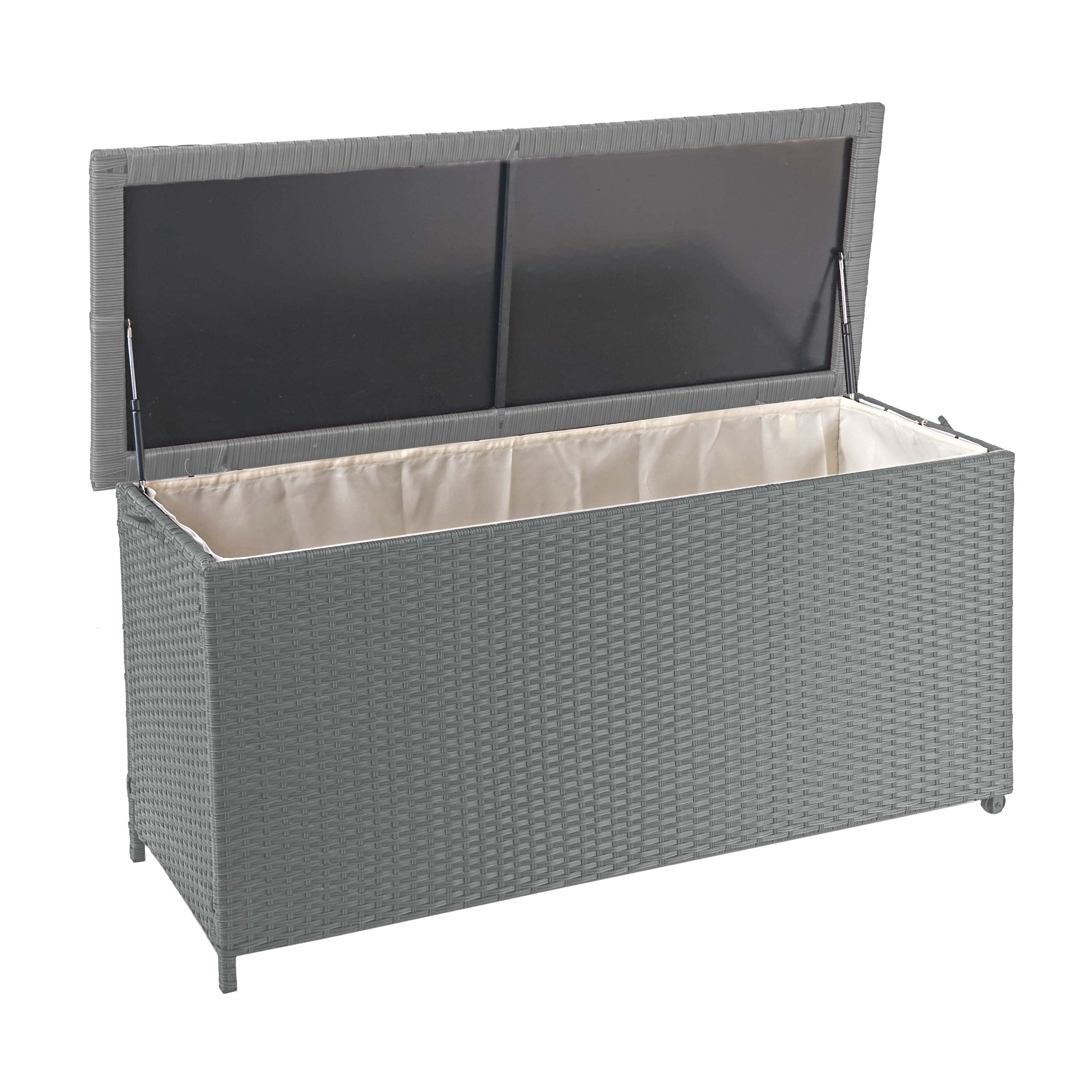 Hinweis zur Nutzung: Der innenliegende wasserabweisende Bezug lässt sich leicht entfernen, bietet jedoch keinen vollständigen Wasserschutz. Eine Aufstellung an einem regensicheren Ort wird empfohlen. Dank der Rollen und Griffe ist die Truhe leicht zu transportieren und bietet einen sicheren Stand.