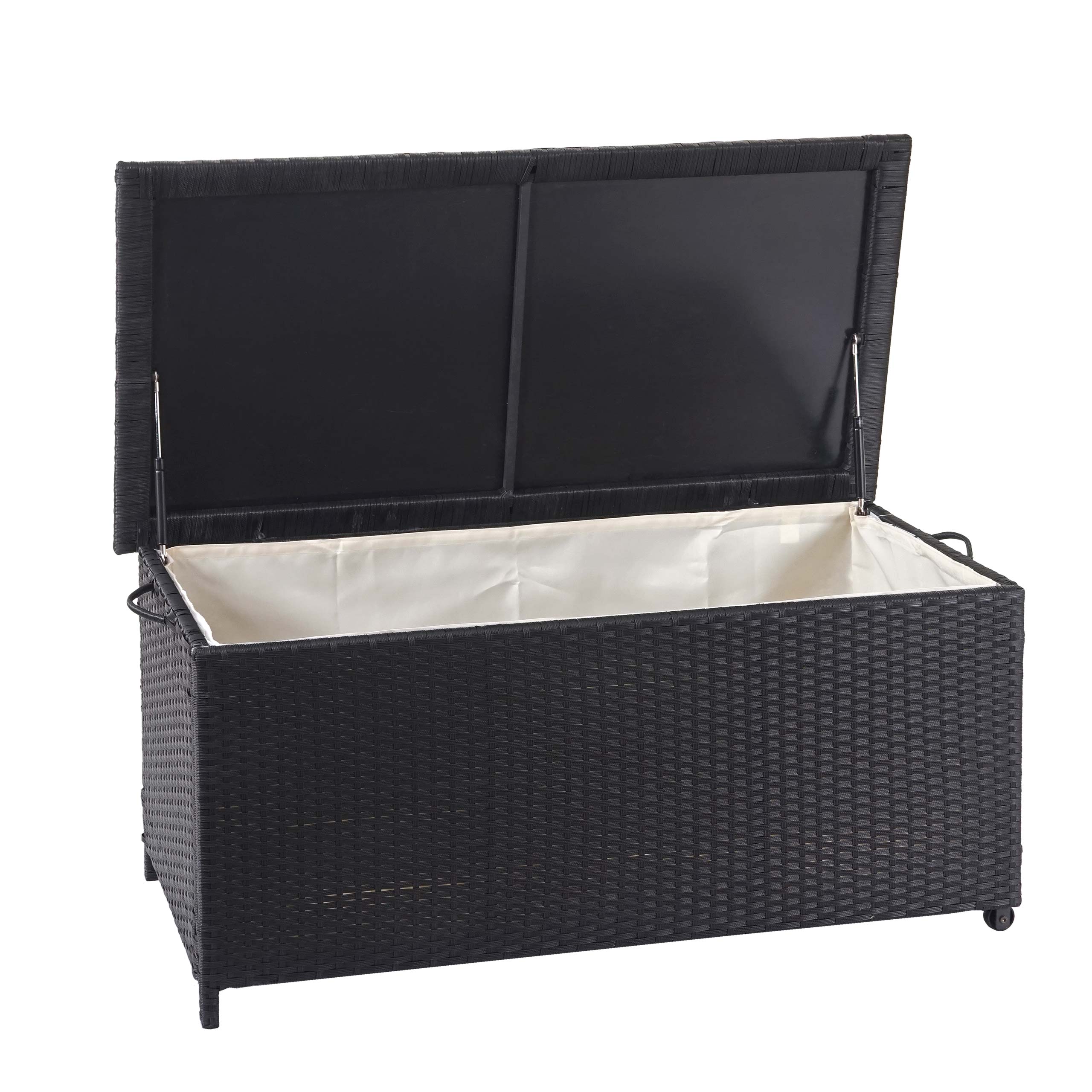 Im Innenraum befindet sich ein wasserabweisender Bezug, der sich mittels Klettband bei Bedarf schnell entfernen lässt. Für mehr Stabilität ist der Deckel mit einer PVC-Einlage verstärkt, so dass man diese Truhe auch sehr gut als Ablage nutzen kann. Der Innenbezug ist wasserabweisend, jedoch nicht wasserfest. D.h. mit der Zeit dringt wie bei allen uns bekannten Poly-Rattan-Boxen Feuchtigkeit ein. Wir empfehlen Ihnen daher die Aufstellung an einem regensicheren Platz. Durch zwei Rollen an einer Seite lässt sich die Truhe ganz einfach verschieben, setzt man sie ab, hat die Truhe durch die Füße auf der anderen Seite einen sicheren Stand. Mittels der Griffe auf beiden Seiten ist die Poly-Rattan Truhe in unbefülltem Zustand auch ganz leicht zu tragen.