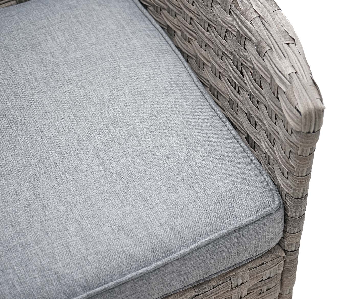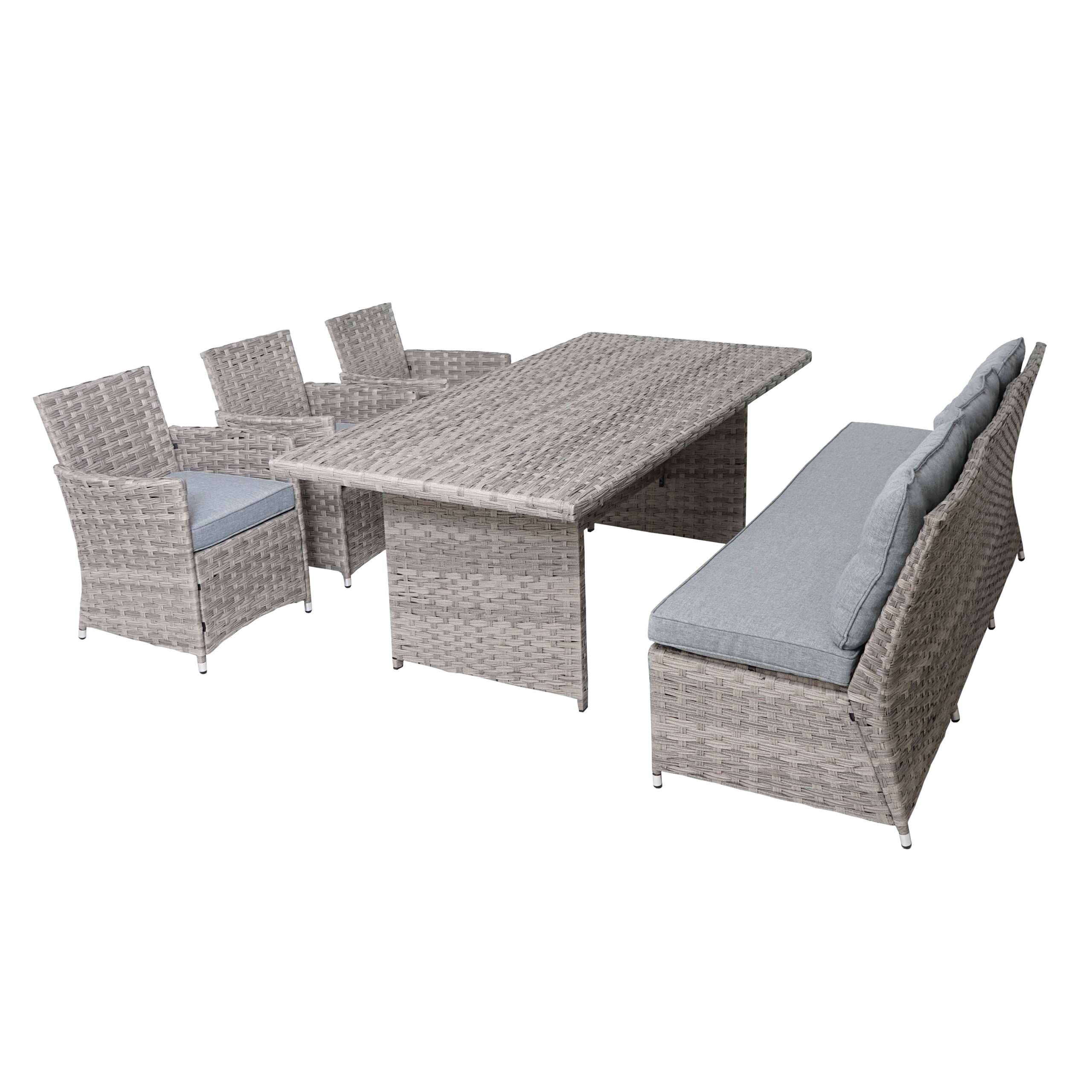 Schick, modern und absolut zeitlos – diese Gartengarnitur gibt immer und überall eine gute Figur ab. Ob nun unter einer Pergola im Grünen, auf dem Balkon oder im Wintergarten, dieses Set fügt sich nahtlos in jede Umgebung ein. Durch die dicken Sitzpolster ist für ausreichend Bequemlichkeit gesorgt und die Bank ist durch die Rückenkissen natürlich noch komfortabler. Die Tischplatte ist unterhalb des Rattans noch mit einer Polypropylen-Platte verstärkt, um für mehr Stabilität zu sorgen. Das Rattan selbst ist etwas breiter als gewöhnlich und erhält dadurch eine schönere Optik.