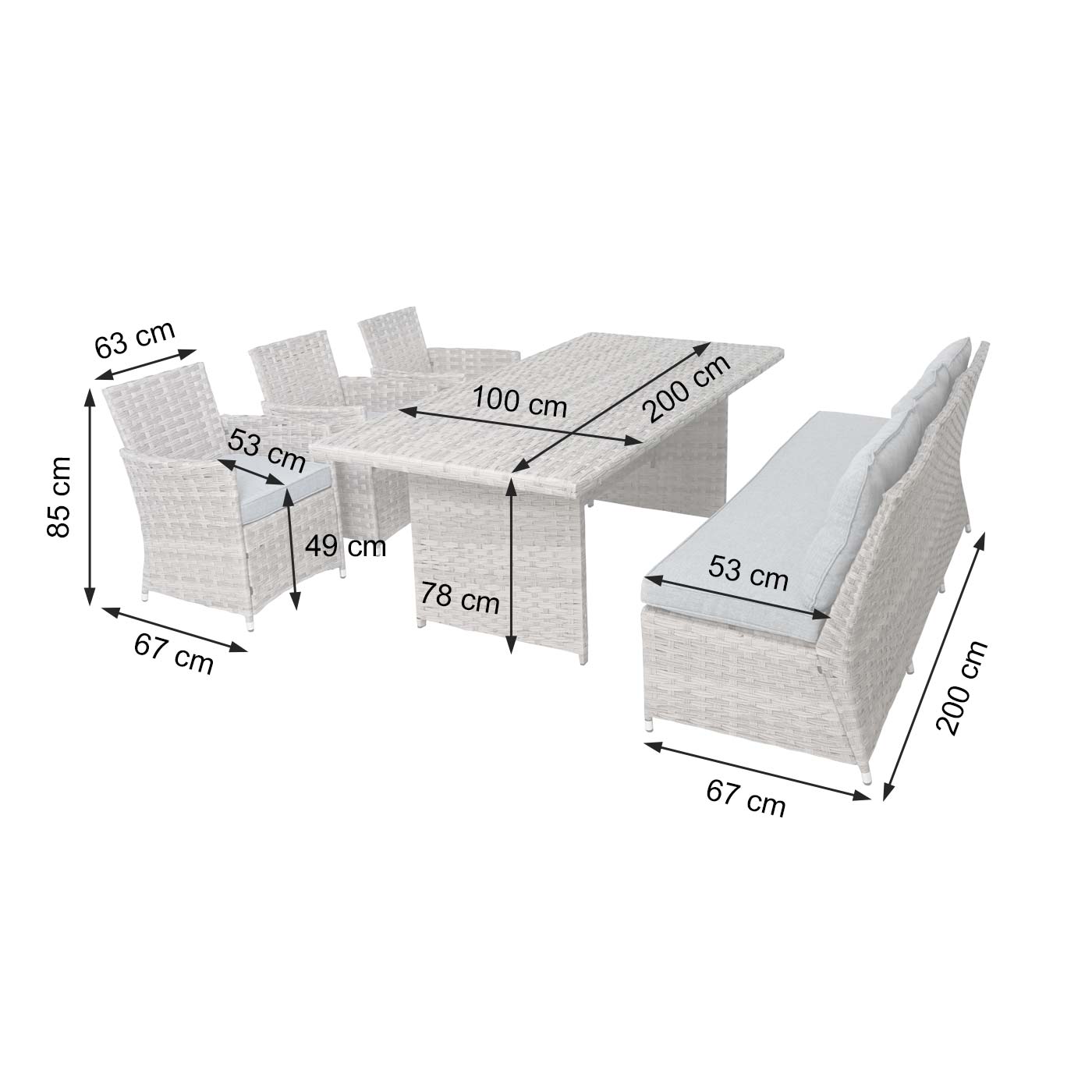 – Lieferumfang: 1x 3er-Bank, 3x Sessel, 1x Tisch (ohne Dekoration)