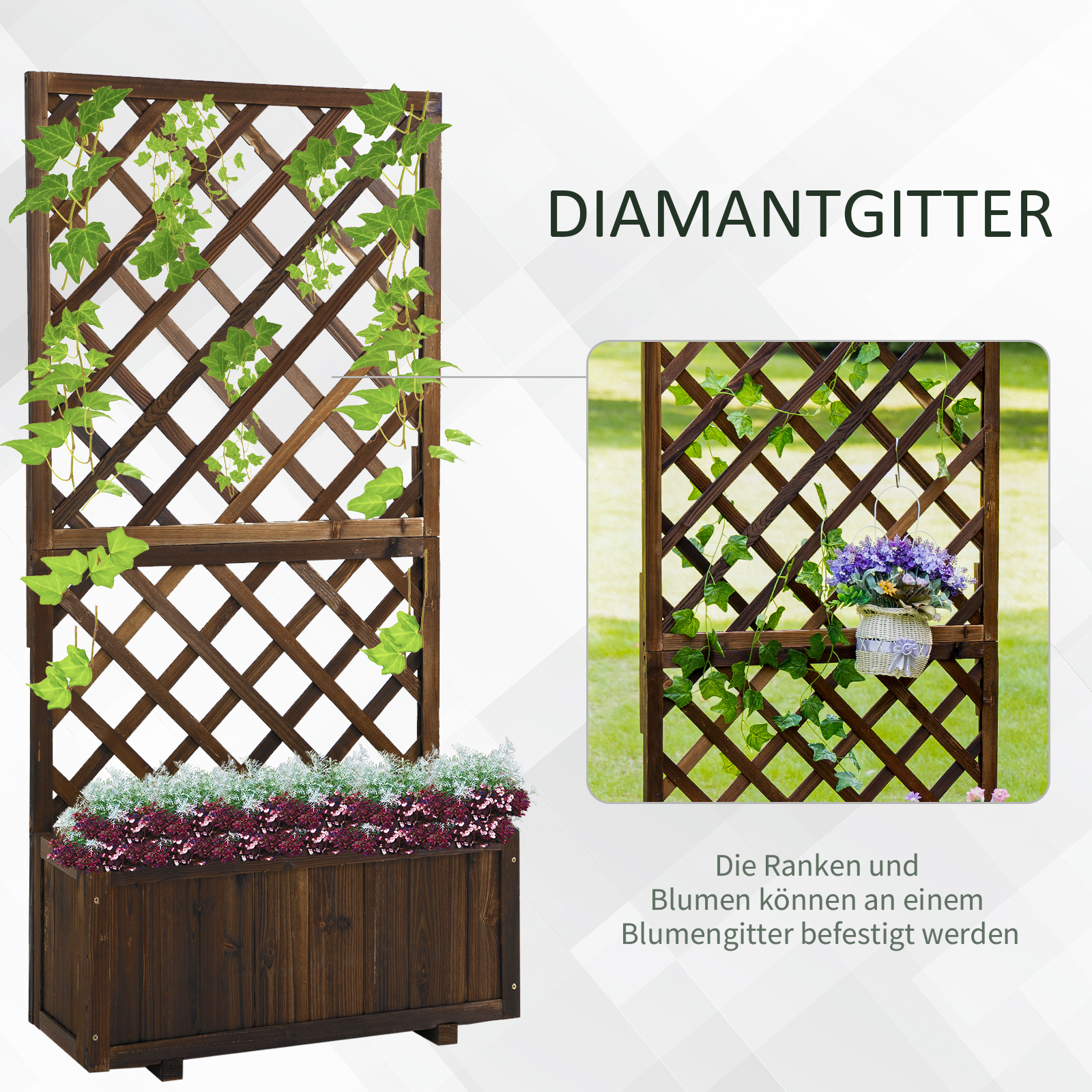 Setzen Sie Ihre Lieblingsgewächse geschmackvoll in Szene und verleihen Sie Ihrem Außenambiente eine charaktervolle Note mit diesem rustikalen Blumenkasten! Das stabile Spalier liefert die ideale Gelegenheit, um dekorative Klettergewächse zu kultivieren und Ihren Garten geschmackvoll aufzulockern. Der Rahmen aus witterungsbeständigem Massivholz schützt den Blumenkasten vor jedem Wetter und erlaubt Ihnen, das Hochbeet für Garten dauerhaft im Freien und einzusetzen.