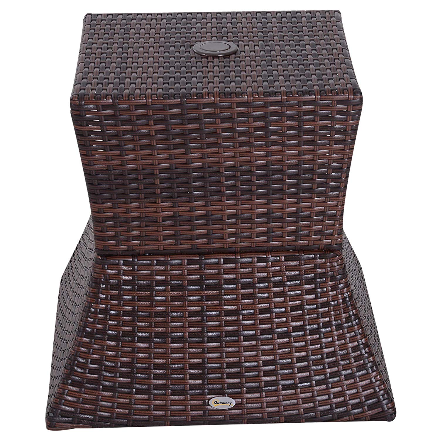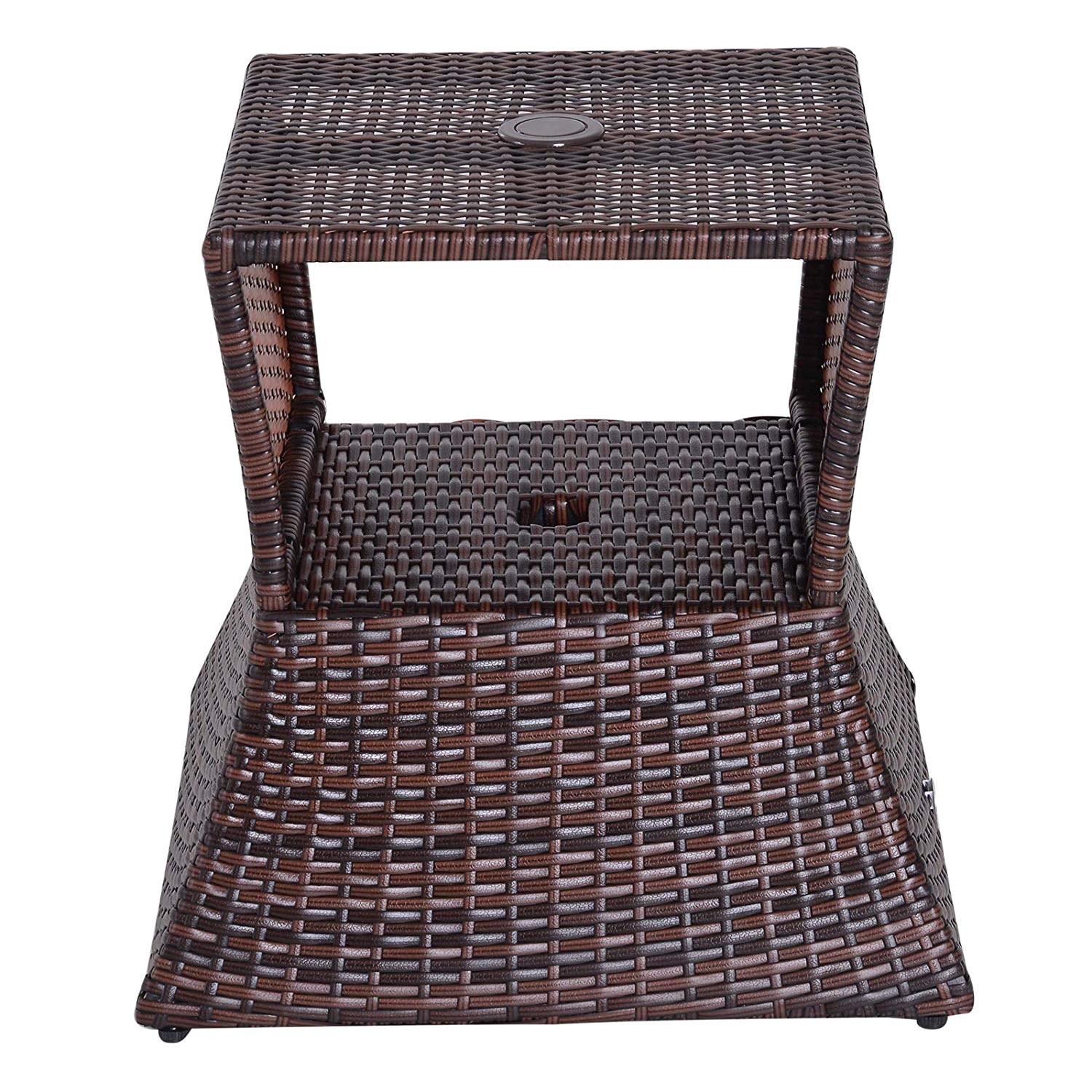 Unser innovativer Gartentisch ist dank des kompakten Designs bestens für den flexiblen Gebrauch in Ihrem Garten, auf Ihrer Terrasse oder auch am Pool geeignet. Mit der Halterung für Sonnenschirme in der Mitte dient unser Beistelltisch außerdem als Schirmständer. Die robuste Oberfläche aus Polyrattan sorgt für eine lange Lebensdauer trotz Gebrauch im Freien.