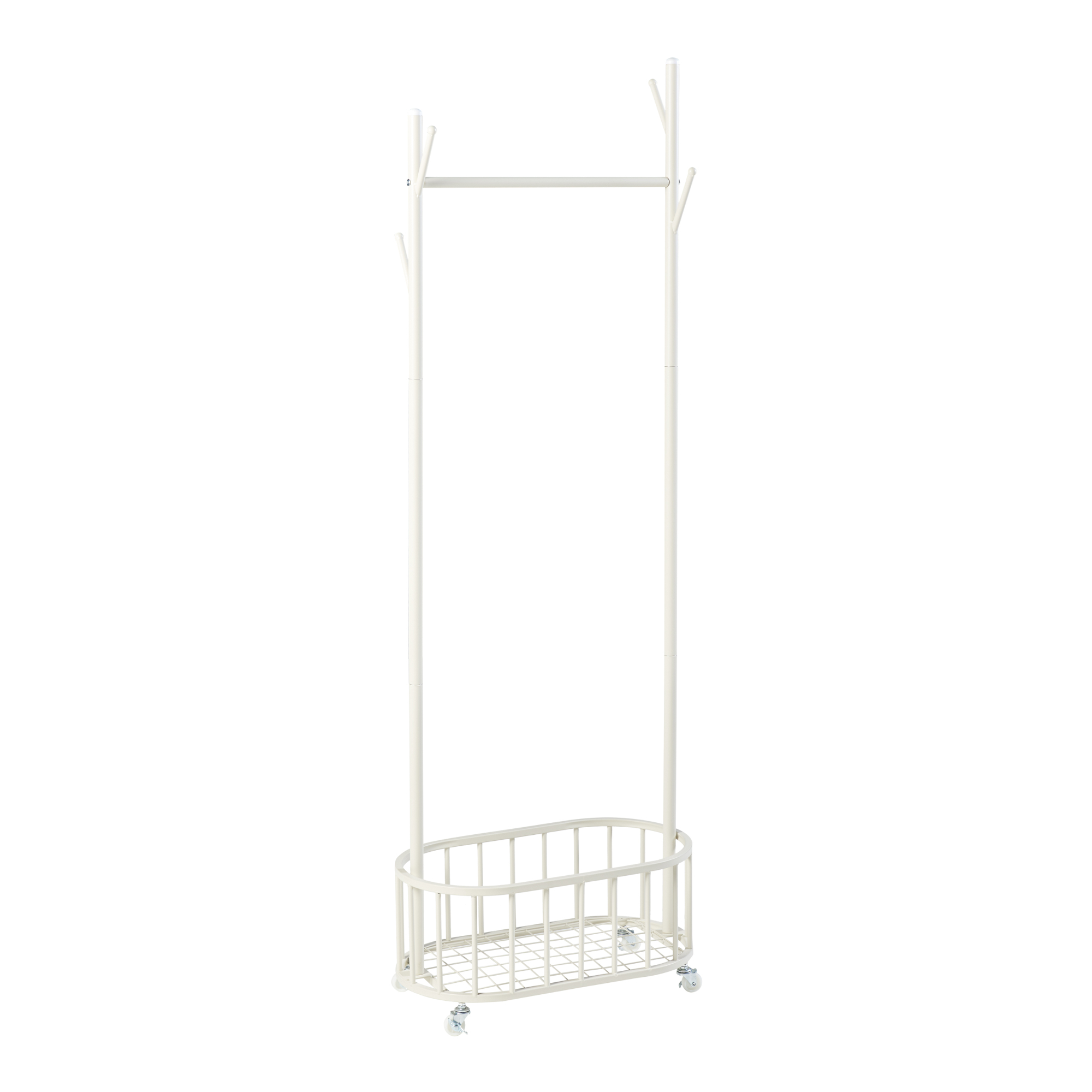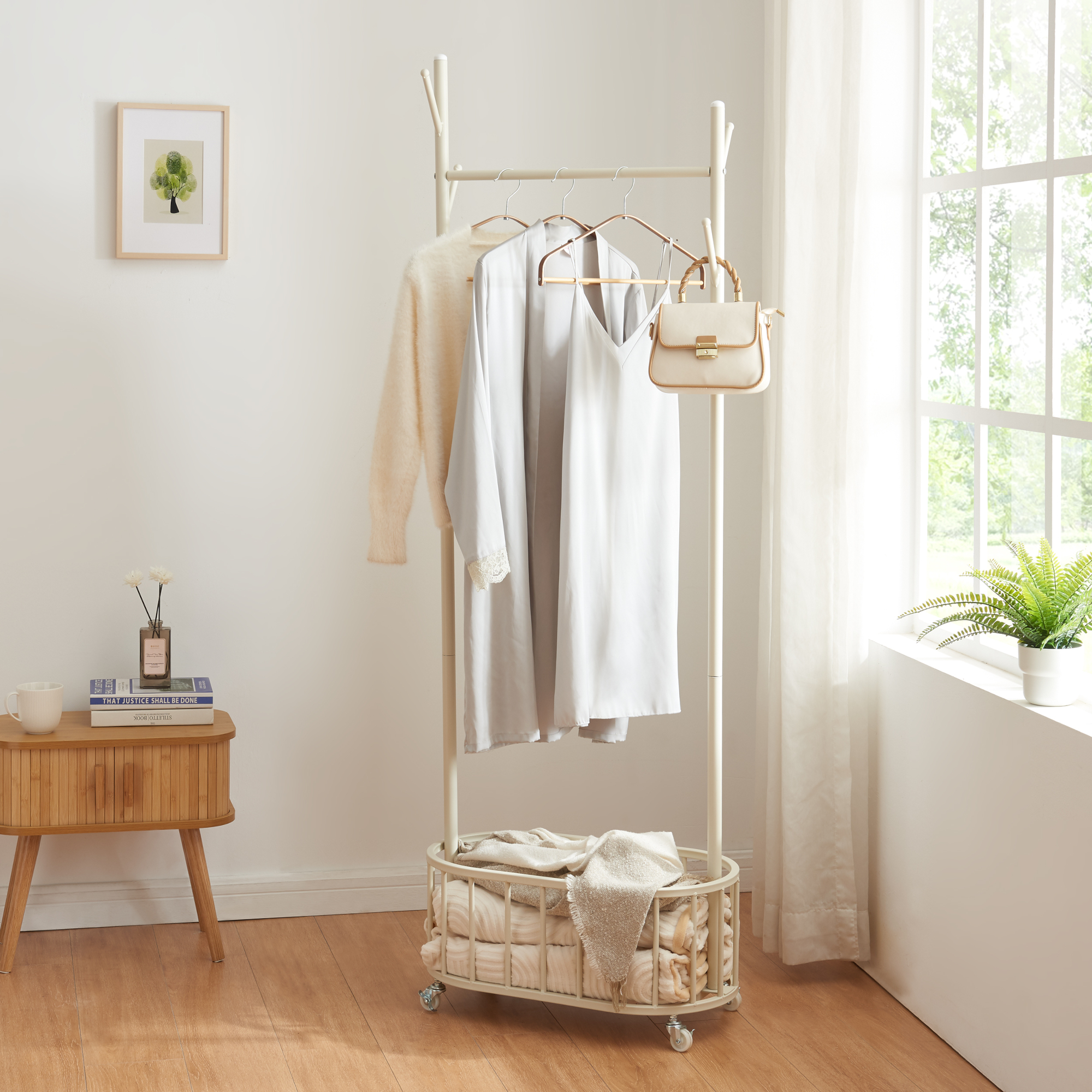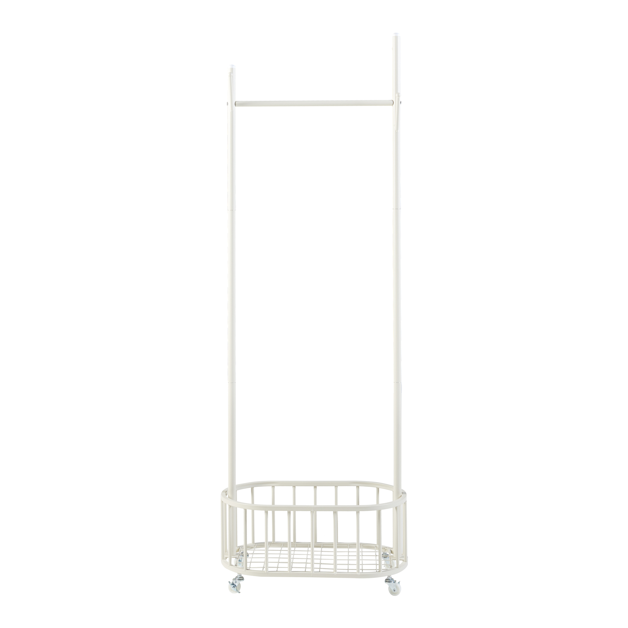 Der praktische und rollbare Kleiderständer lässt sich schnell und einfach aufbauen. Er verfügt über eine Garderobenstange, einen integrierten Wäschekorb und insgesamt vier Kleiderhaken.