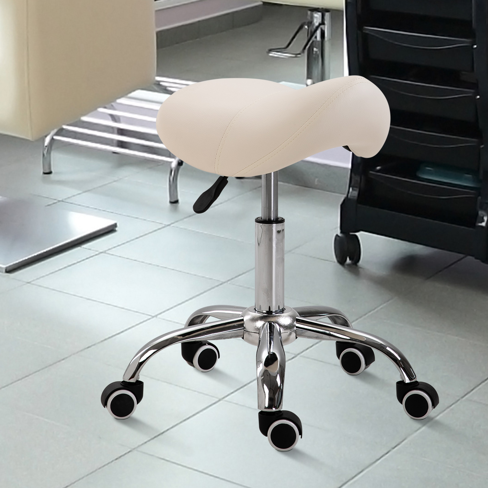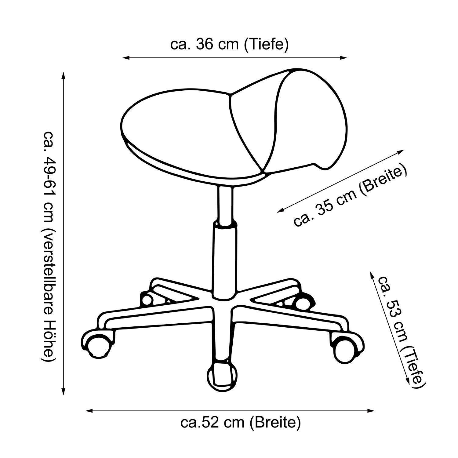 Dieser ergonomische Roll- / Kosmetikhocker in Sattelform sorgt durch seine besondere Sitzform automatisch für eine aufrechte Haltung, welche die Wirbelsäule entlastet. Der Sattelhocker, auch bekannt als Friseurhocker, ist mit einer komfortablen Gasfeder ausgestattet, um die Höhe anzupassen, und ist drehbar. Die gepolsterte Sitzfläche besteht aus glattem, pflegeleichtem Kunstleder. Der Kreuzfuß des Hockers ist mit fünf stabilen Nylonlaufrollen versehen. Dieser praktische Hocker eignet sich ideal für den täglichen Gebrauch zu Hause, in Friseursalons, Kosmetikstudios oder Büros.