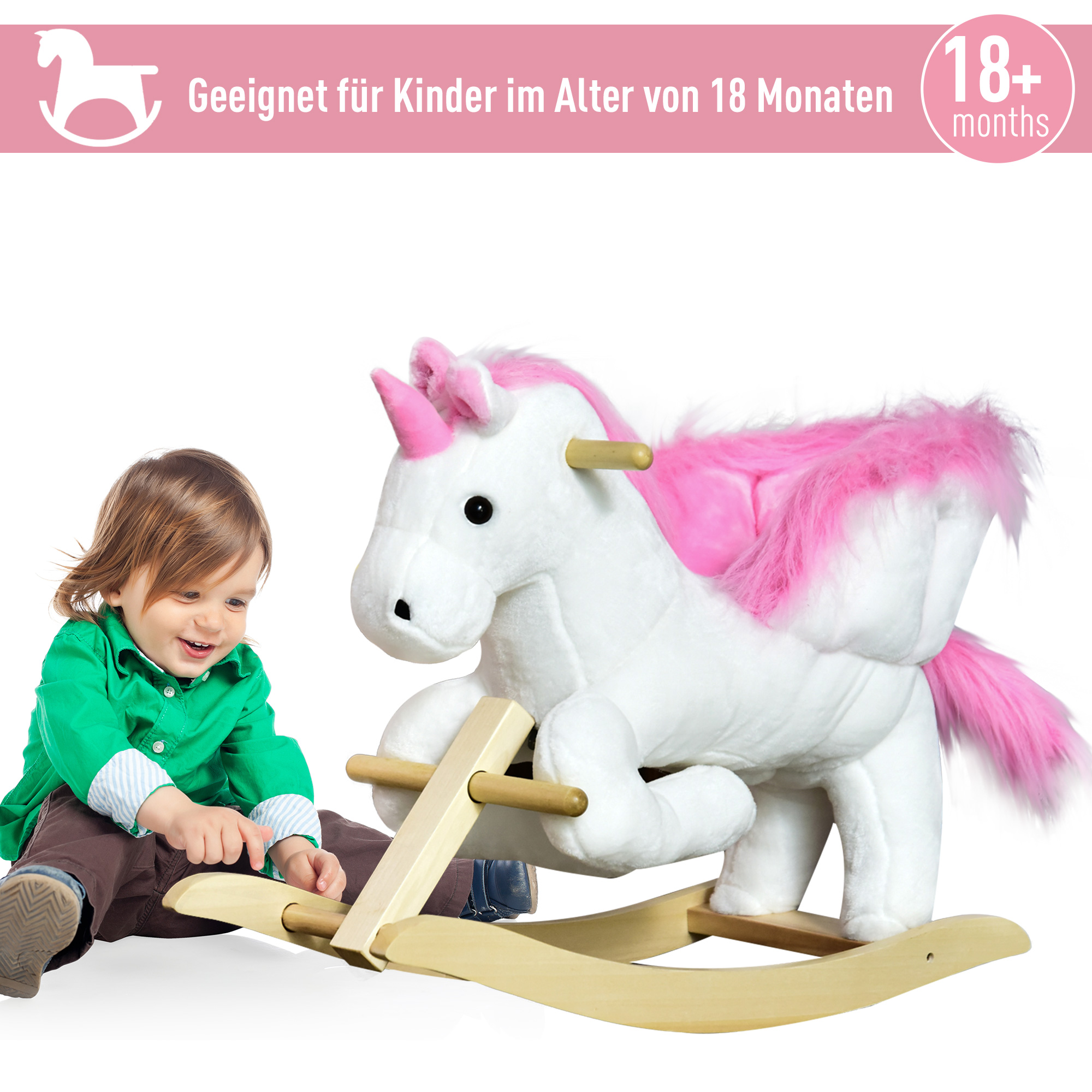 Dieses Kinder-Schaukelpferd ist ein bezauberndes Spielzeug, das die Fantasie Ihres Kindes beflügelt. Der Schaukelrahmen aus glattem Holz und verstärktem Stahl ist robust, stabil und leicht. Der Sitz im niedlichen magischen Einhorn-Design ist farbenfroh, plüschig und weich. Der breite Sitz sorgt für Komfort und die vorderen Griffe und Fußstützen für Sicherheit. Die leicht zugängliche Musiktaste am Ohr spielt ein sanftes Schlaflied, das Ihr Kind begeistern wird.