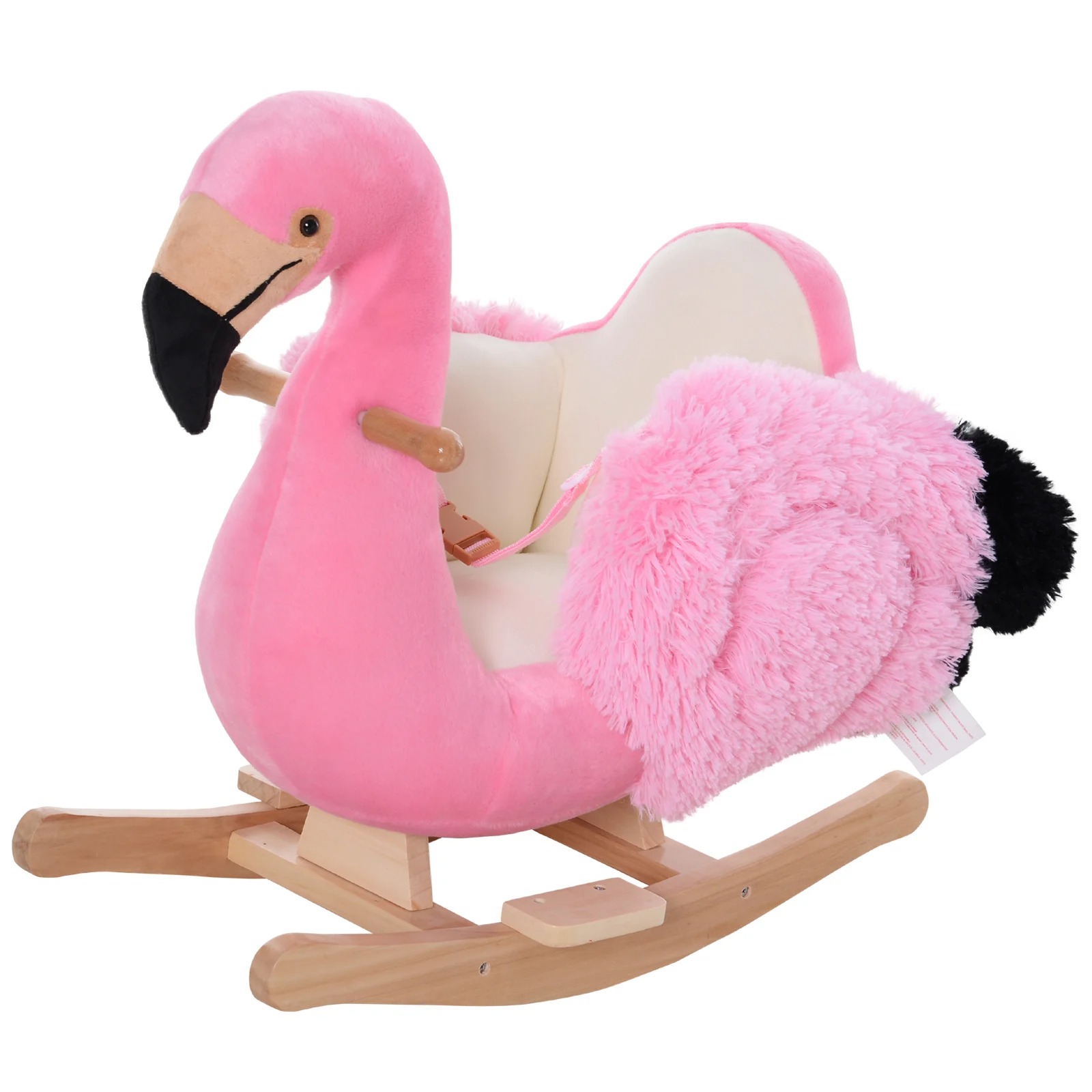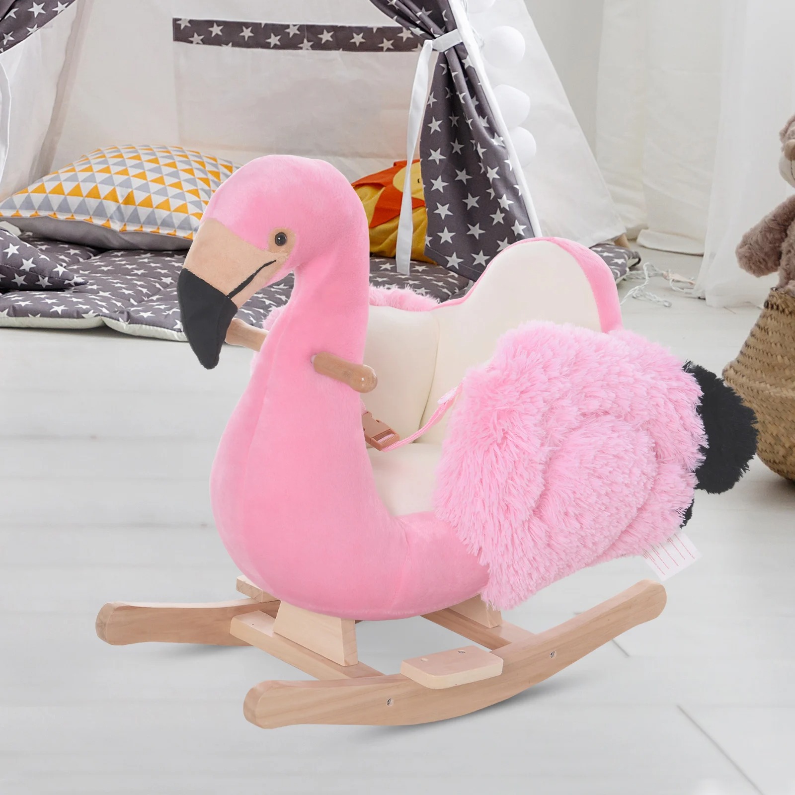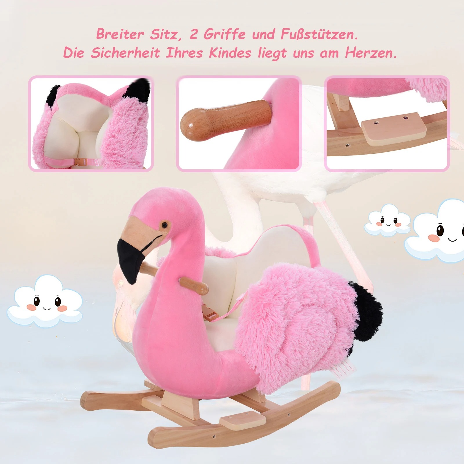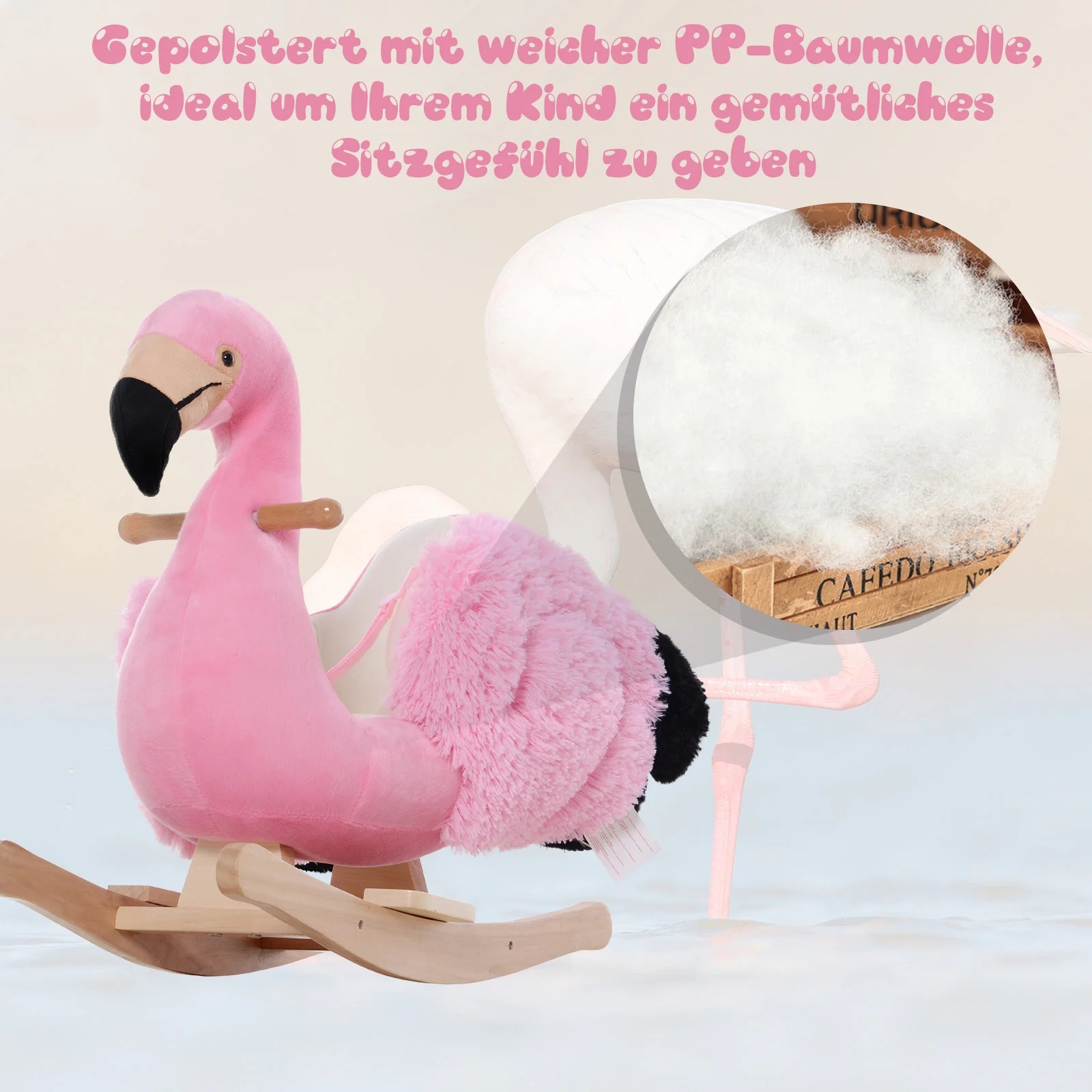 Schenken Sie Ihren Liebsten einen furchtlosen Begleiter! Der Schaukelflamingo ist mit weichem Plüsch bezogen. Es eignet sich für Kinder zwischen 18 und 36 Monaten. Die Schaukelkufen sind aus robustem Holz mit abgerundeten Kanten. Ein Gurt sorgt für weitere Sicherheit.