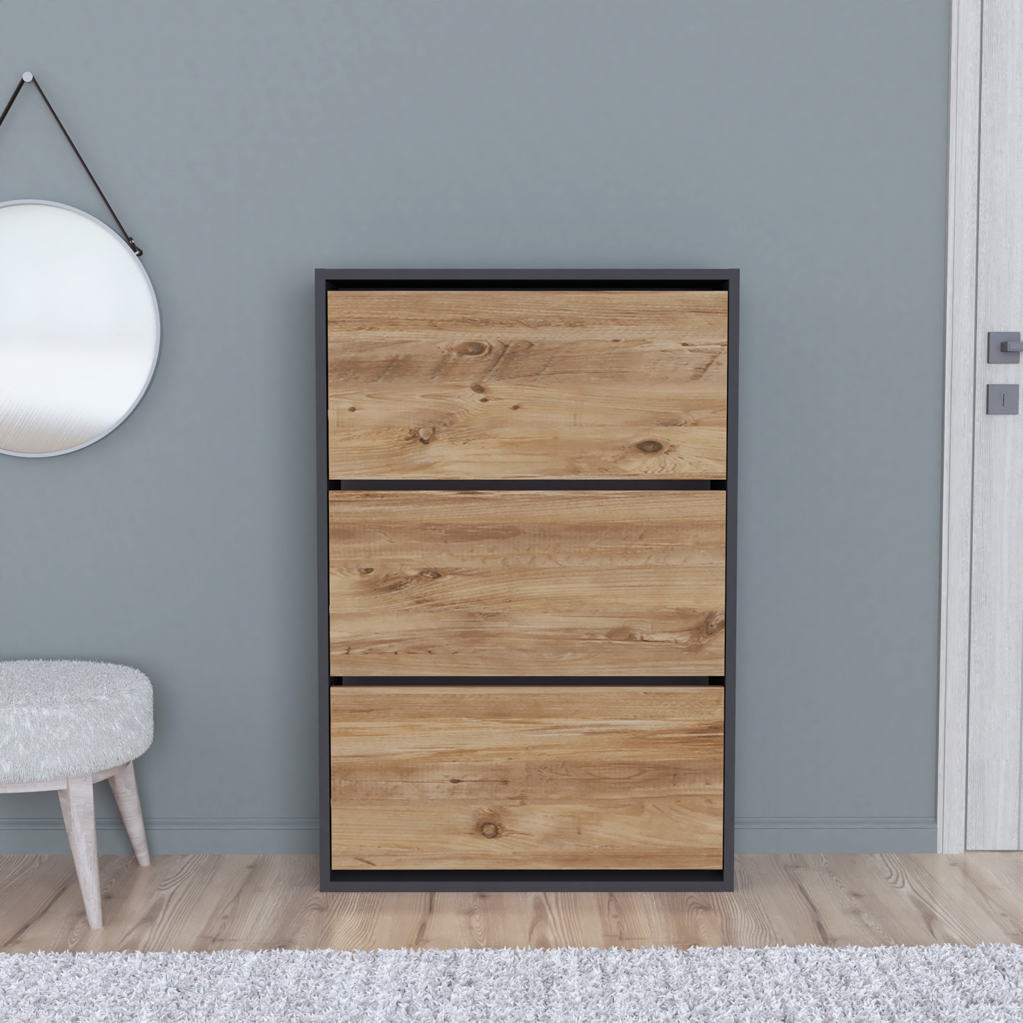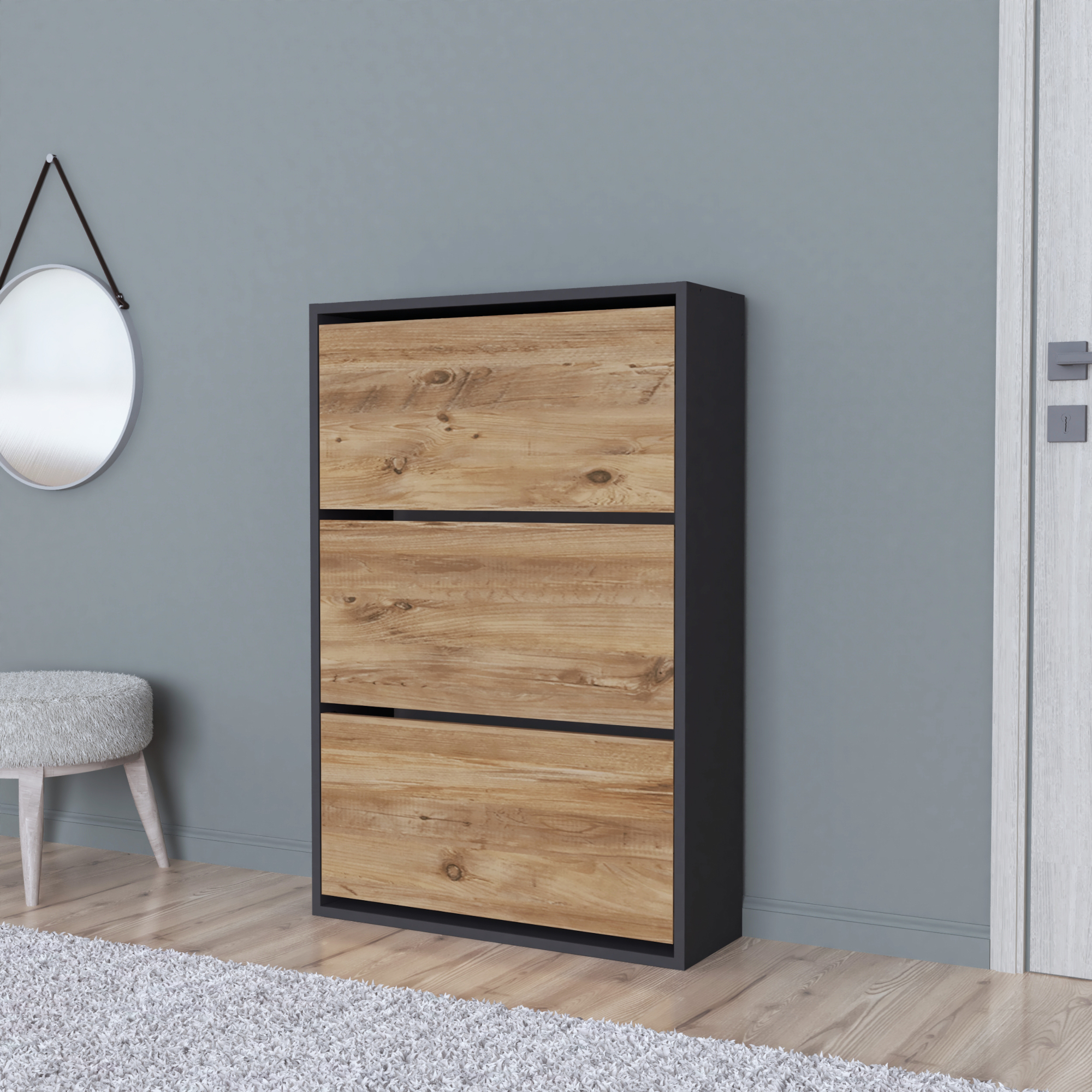 Der moderne Schuhkipper verfügt über drei Kipptüren und bietet Ihnen die ideale Lösung zur platzsparenden Aufbewahrung Ihrer Schuhe. Mit seinem ansprechenden Design wird er zum Blickfang in jedem Raum.