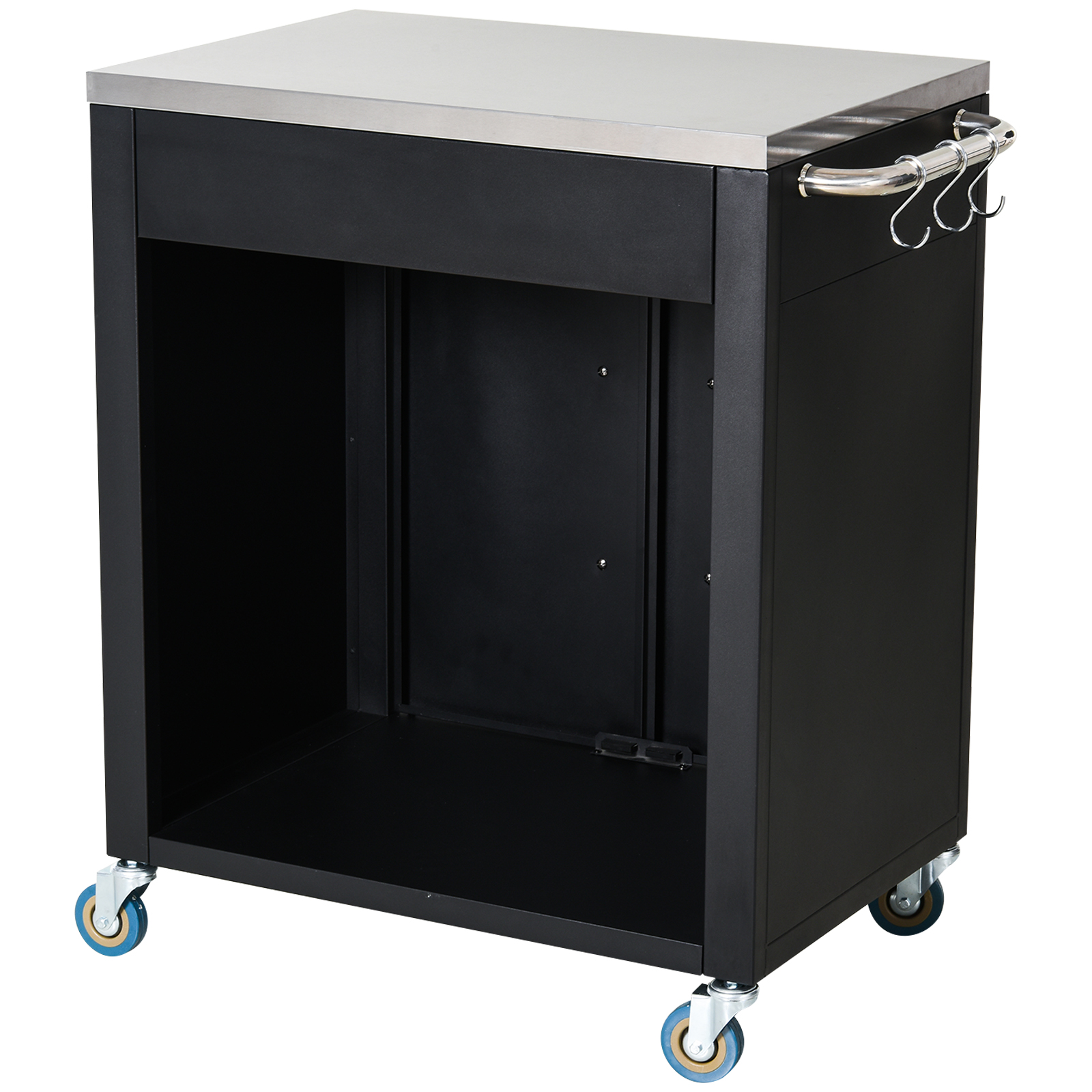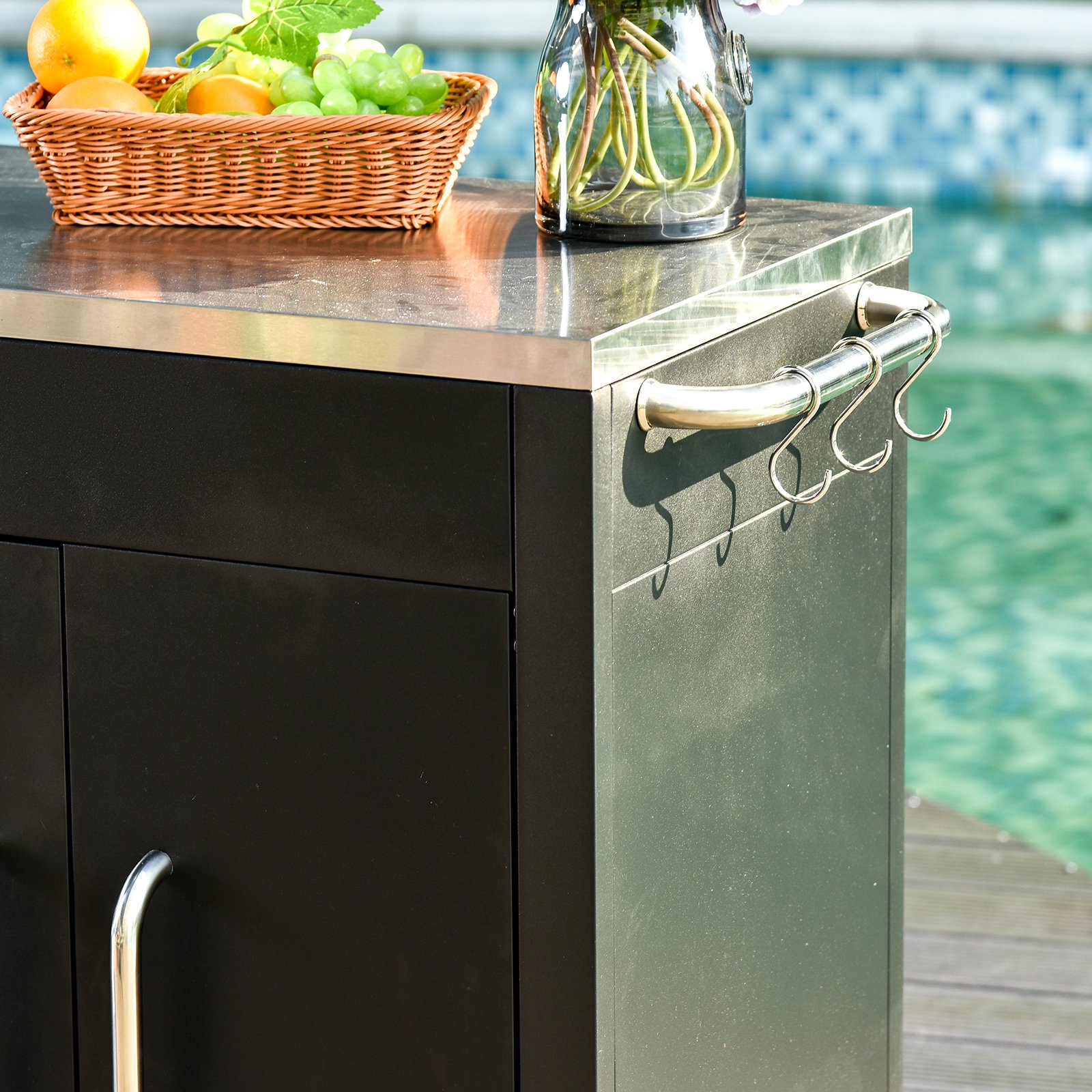 Im Vergleich zu einer normalen hölzernen Küchentheke ist diese aus Eisen gefertigte Theke einfacher zu reinigen und leichter zu verstauen. Dank des rücksichtsvollen Designs wurde eine Seitenwand weggelassen, sodass Sie beim Zubereiten von Speisen leichter an Ihr Zubehör kommen. Sechs verchromte Haken bieten Stauraum für Küchenzubehör. Ein kompakter und voll funktionsfähiger Kücheninselwagen erwartet Sie.