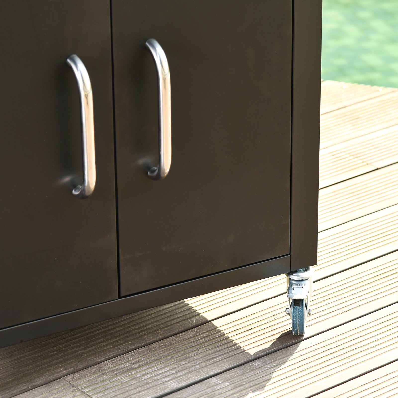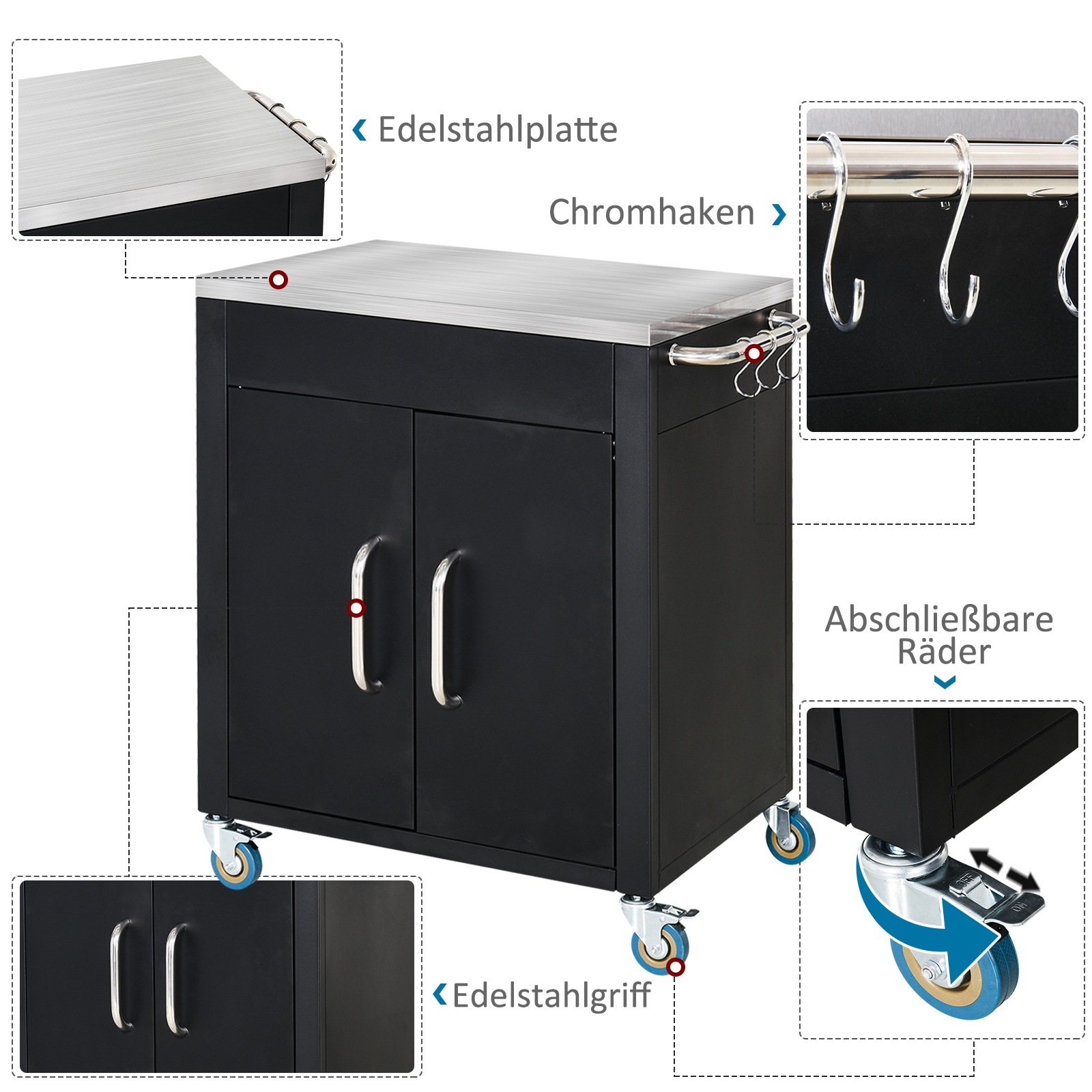 - 4 rollende Räder zum leichten Bewegen, 2 davon sind abschließbar.