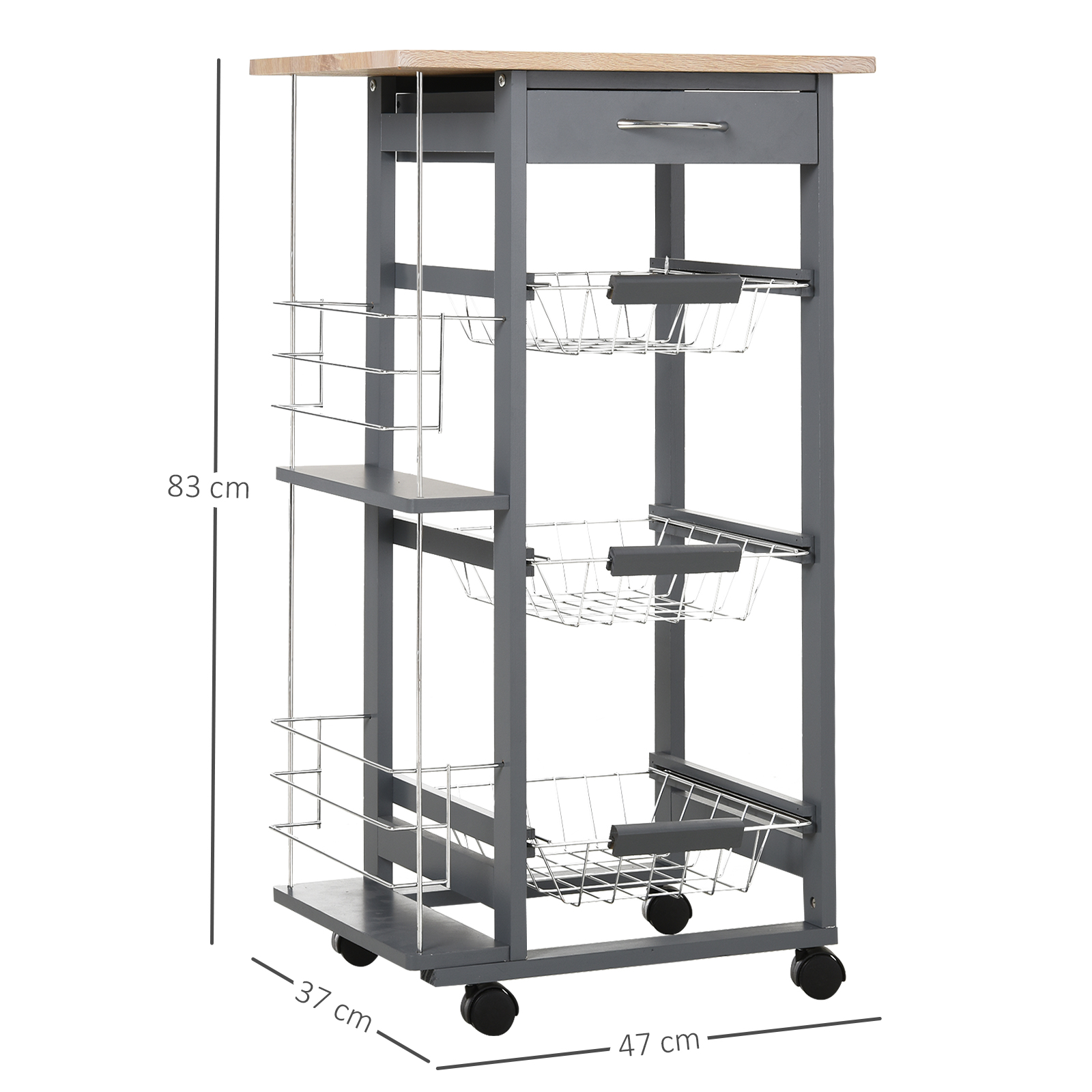 Mit seinem prägnanten Design kann der Servierwagen sowohl im Innen- als auch im Außenbereich eingesetzt werden. Die drei Körbe sind abnehmbar und bieten genügend Platz zum Aufbewahren von Obst oder Gemüse. Zwei Regale auf der linken Seite bieten zusätzlichen Platz für Ihre Gewürzdosen. In der Schublade können Sie häufig verwendete Kochutensilien platzieren. Dank der Räder können Sie können den Wagen mitnehmen, während Sie ein Picknick machen oder mit Ihren Freunden campen. Er ist so hilfreich und praktisch, dass er in keiner Küche fehlen sollte!