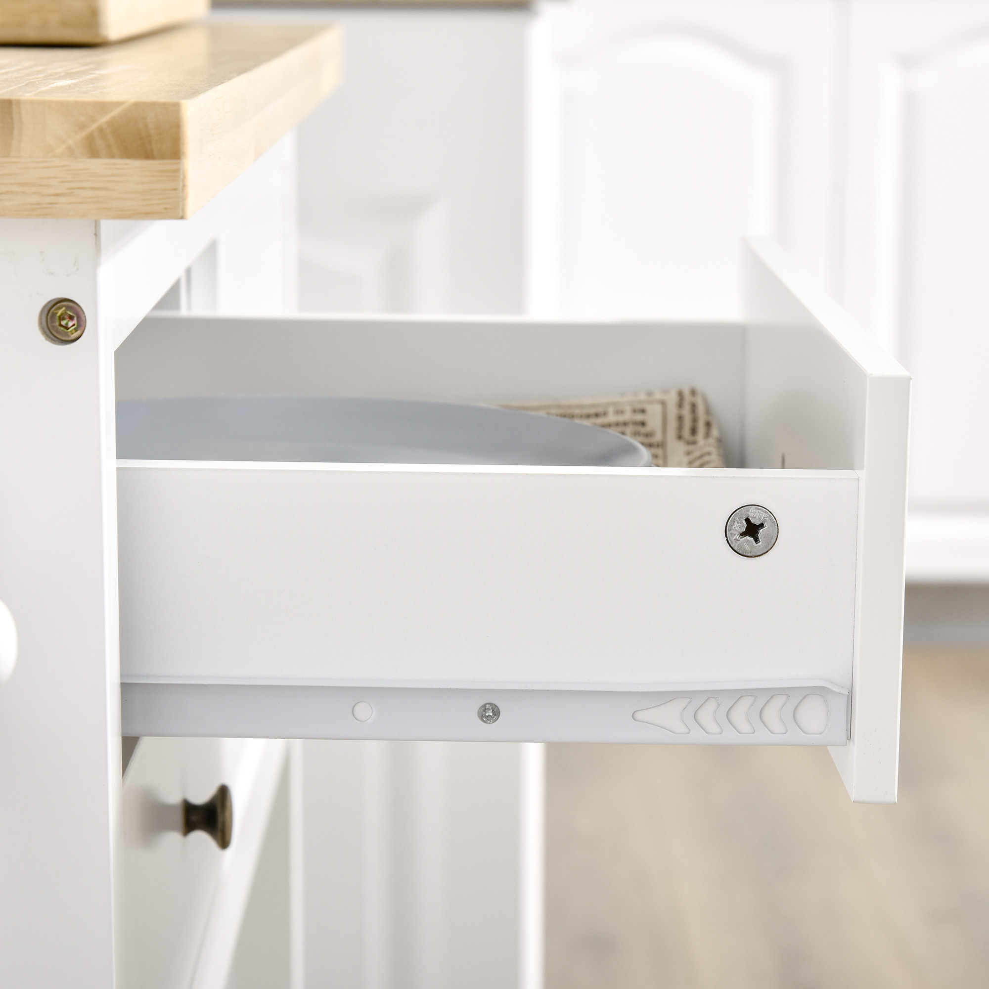 Dieser Küchenwagen kommt mit zwei praktischen Schubladen, einem geschlossenen Schrank, einem untereren Regalboden und einem Handtuchhalter. Zusätzlich bietet der Küchenwagen reichlich Platz für Vorräte und Zubehör. Dank der leichtgängigen Räder können Sie ihn überall dorthin bewegen, wo er am meisten gebraucht wird. Das zweifarbige Design passt zu den meisten Einrichtungen. Die Tischplatte aus massivem Kautschuk und die MDF-Platten sorgen für Langlebigkeit und eine einfache Reinigung.