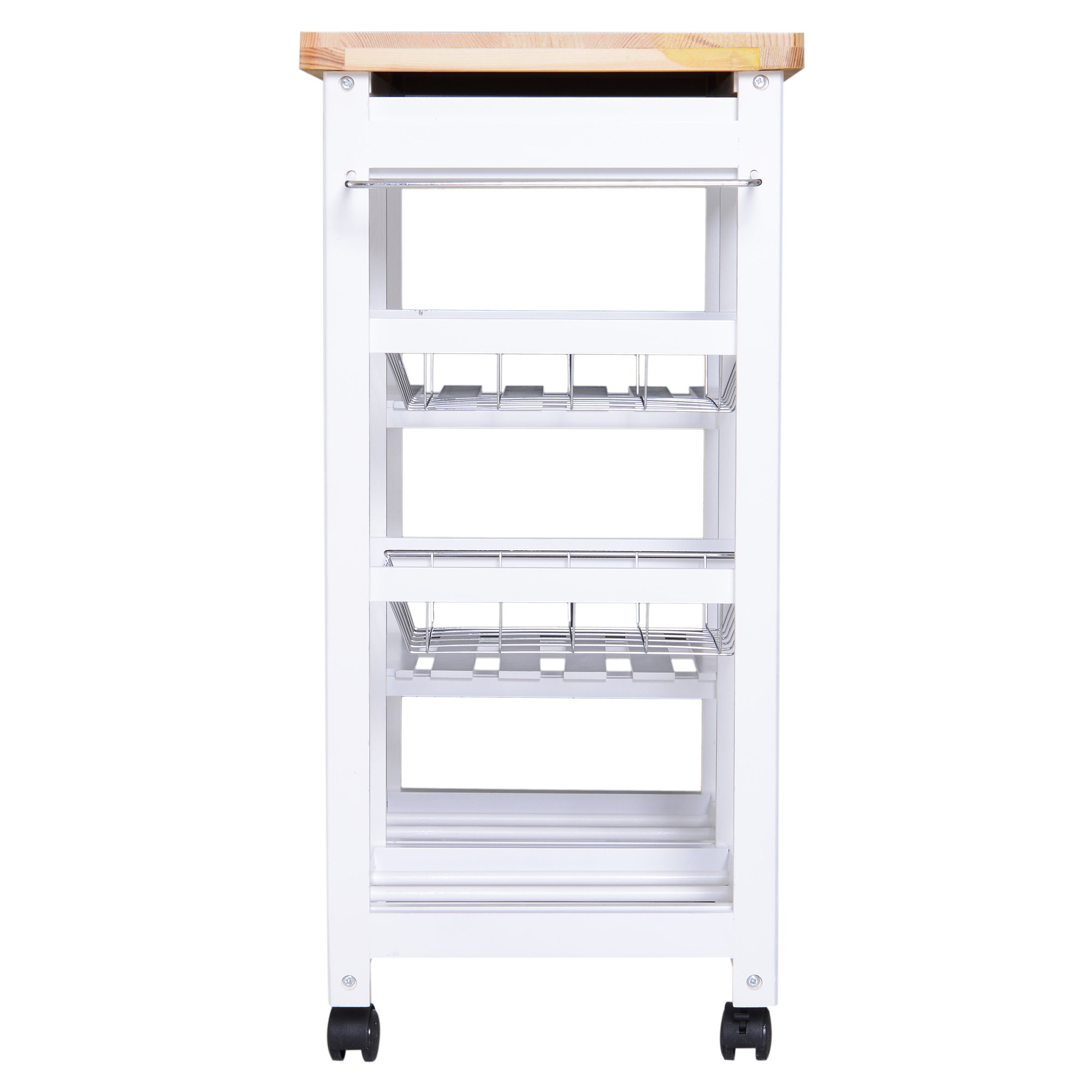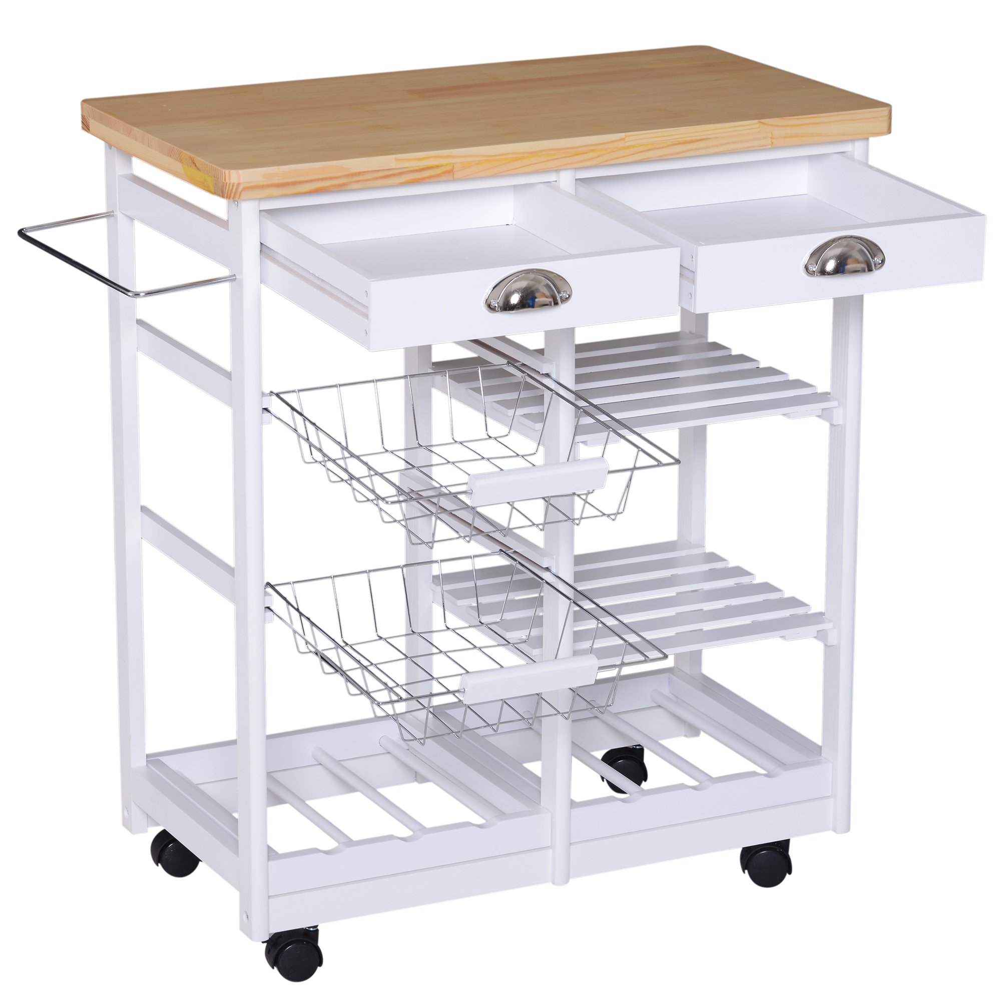 Dieser mobile Küchenhelfer sorgt dafür, dass Sie die Dinge dort haben, wo sie gebraucht werden. HOMCOM bietet durchdachte Staumöglichkeiten für verschieden Küchenutensilien. Mit einer großen Arbeitsplatte, zwei Schubladen, zwei Körben, zwei Ablagefächern, zwei Weinregalen sowie dem praktischen Handtuchhalter bekommt man vieles unter, ohne dass der Wagen selbst zu sperrig ist. Er lässt sich Dank der 4 360°-Rollen (2 davon feststellbar) überall hinrollen und ist immer dort zur Stelle, wo gerade gearbeitet wird. Selbstverständlich bietet er sich auch perfekt als Servierwagen an. Der Unterbau ist aus robusten MDF-Platten gefertigt und sorgt für Stabilität. Die Arbeitsplatte ist aus Kiefernholz und verleiht dem Wagen einen hochwertigen Look.