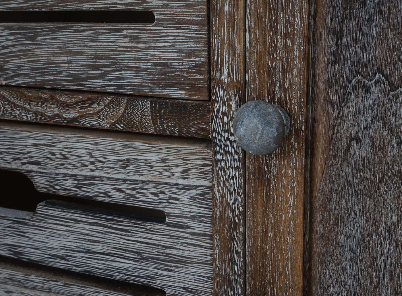 Lassen Sie sich von der lädiert anmutenden Oberfläche nicht täuschen, die Produkte dieser Serie sind qualitativ hochwertig verarbeitet und wurden nur aus den besten Materialien gefertigt. Die Holzelemente wurden hauptsächlich aus der Paulownie hergestellt, einem auch schon in Europa kultivierten Wertholzbaum, der aufgrund seiner Leichtigkeit und hohen Stabilität auch als das Aluminium der Hölzer bezeichnet wird.